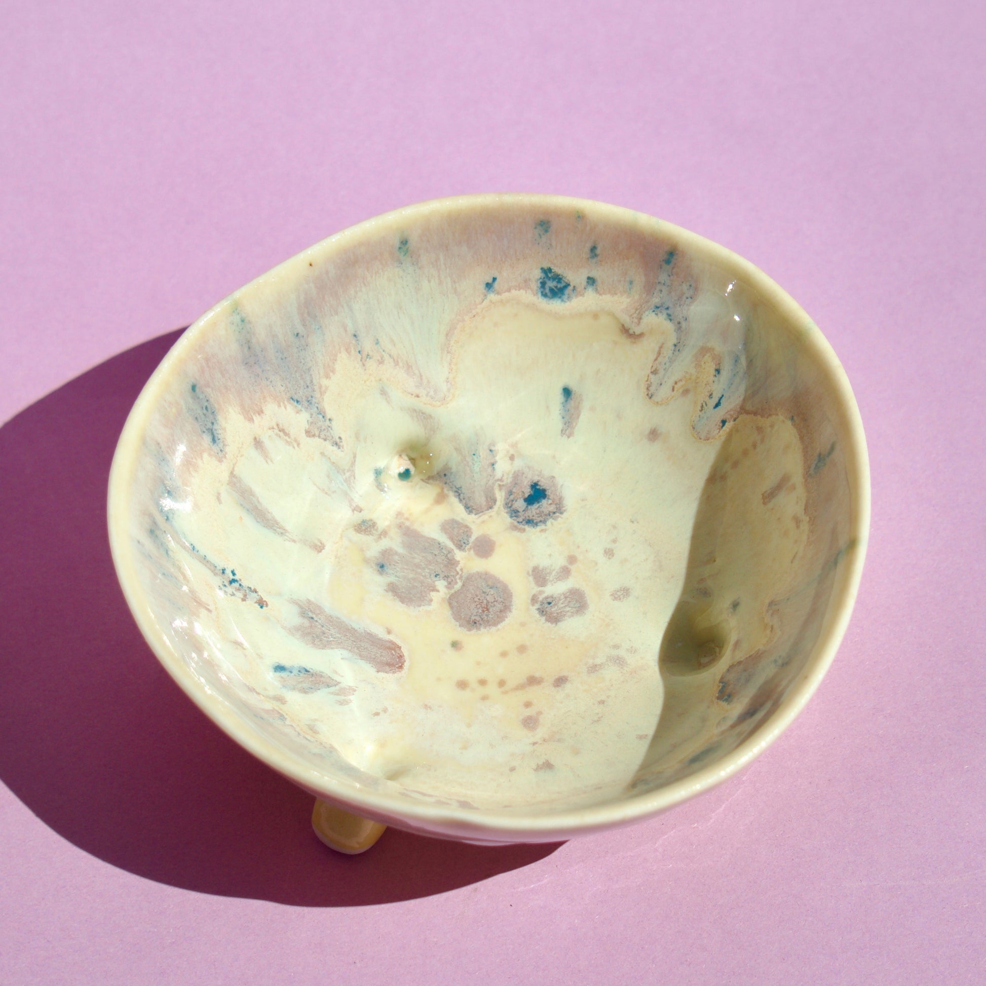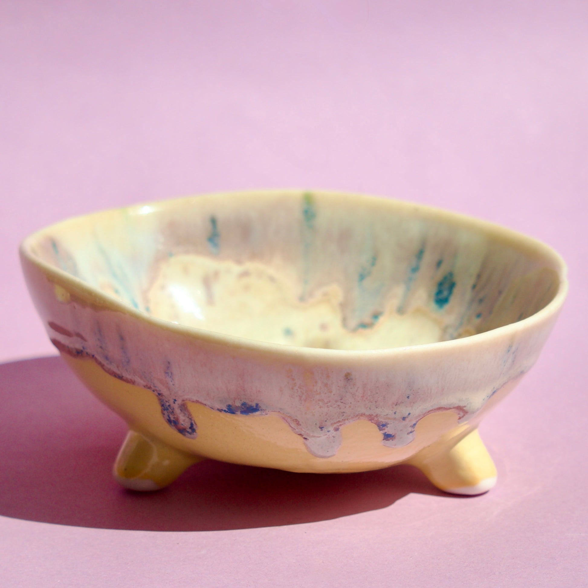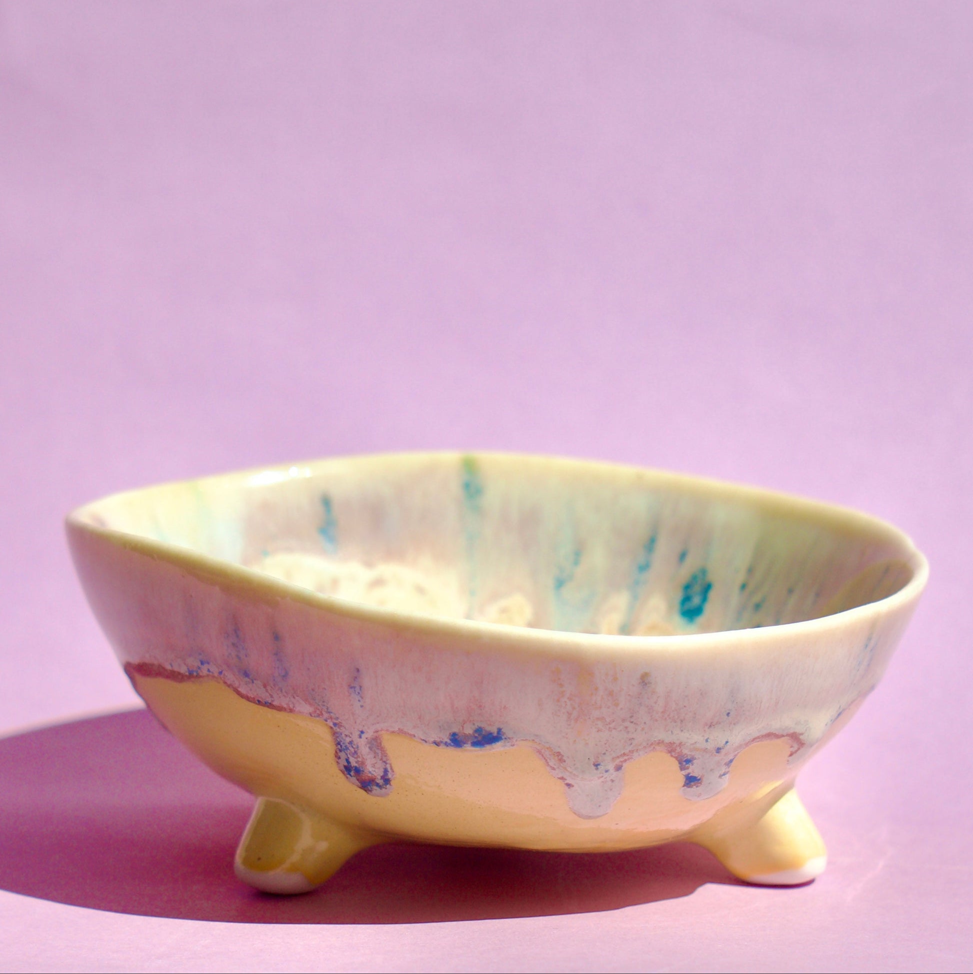 Bol pastelat alb-crem cu trei piciorușe scurte, realizat din semi-porțelan ars la 1200°C. Interiorul este acoperit complet cu glazuri colorate iar exteriorul prezintă un degrade alb-untos, mov pastelat, cu accente de mov si galben.