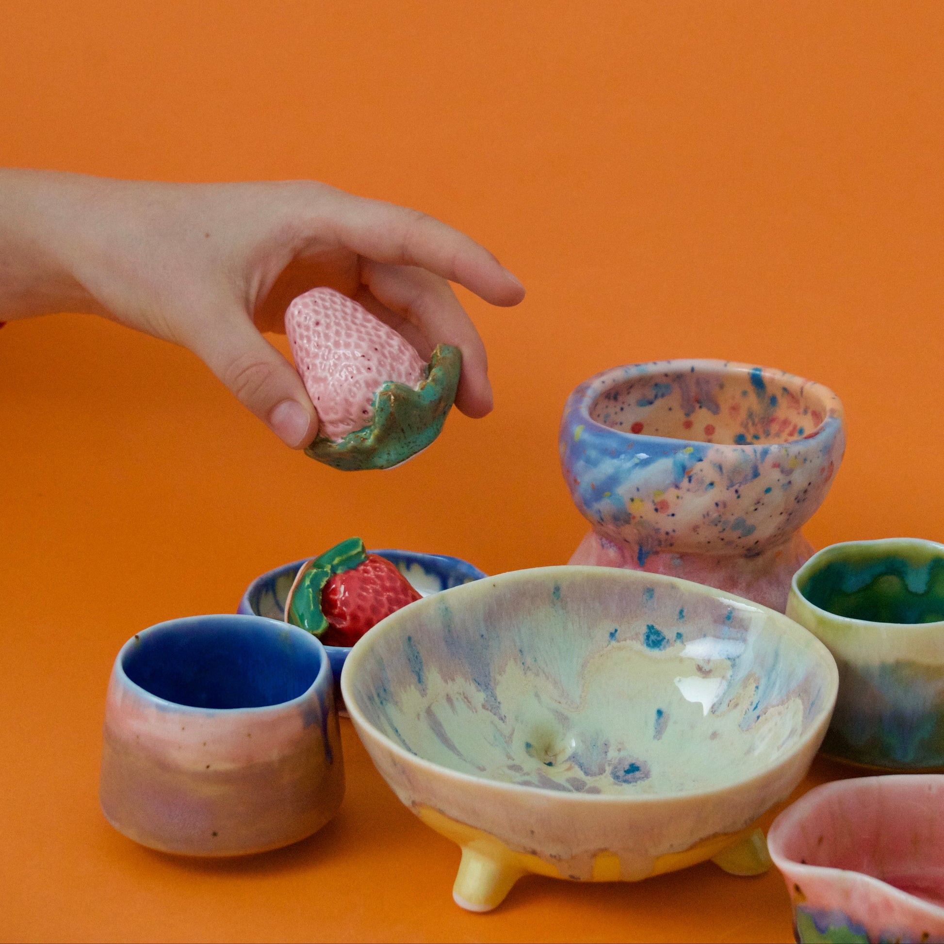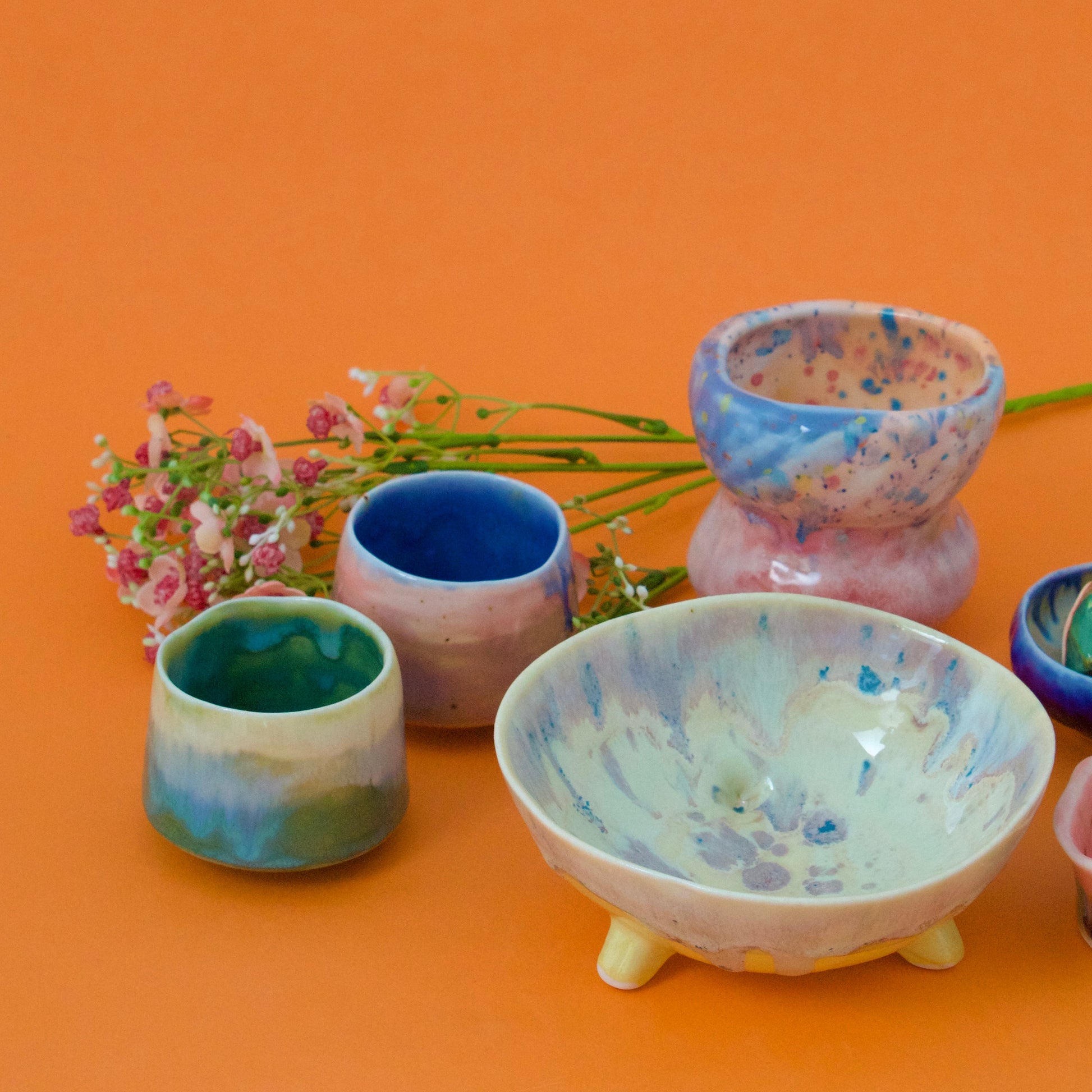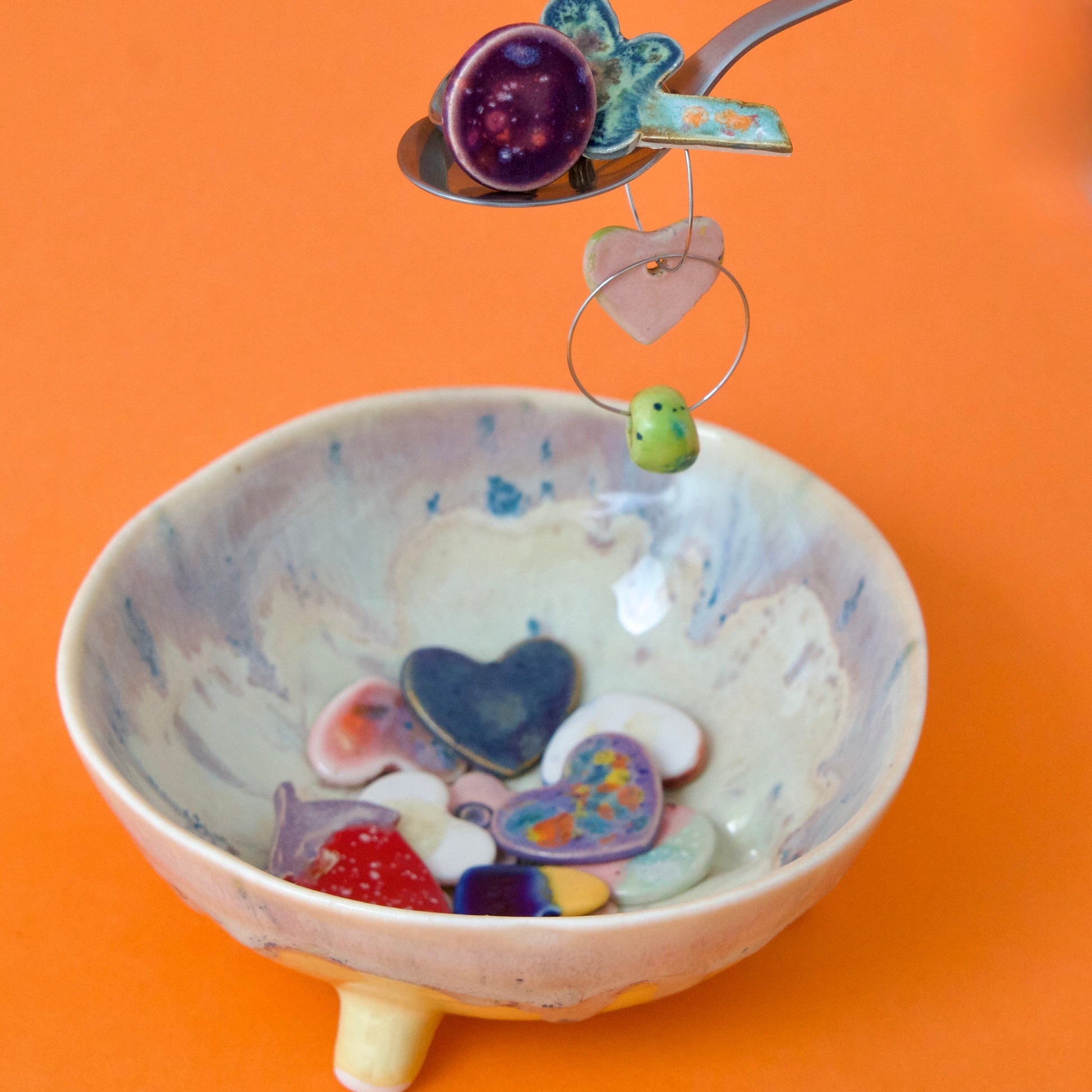 Bol pastelat alb-crem cu trei piciorușe scurte, realizat din semi-porțelan ars la 1200°C. Interiorul este acoperit complet cu glazuri colorate iar exteriorul prezintă un degrade alb-untos, mov pastelat, cu accente de mov si galben.