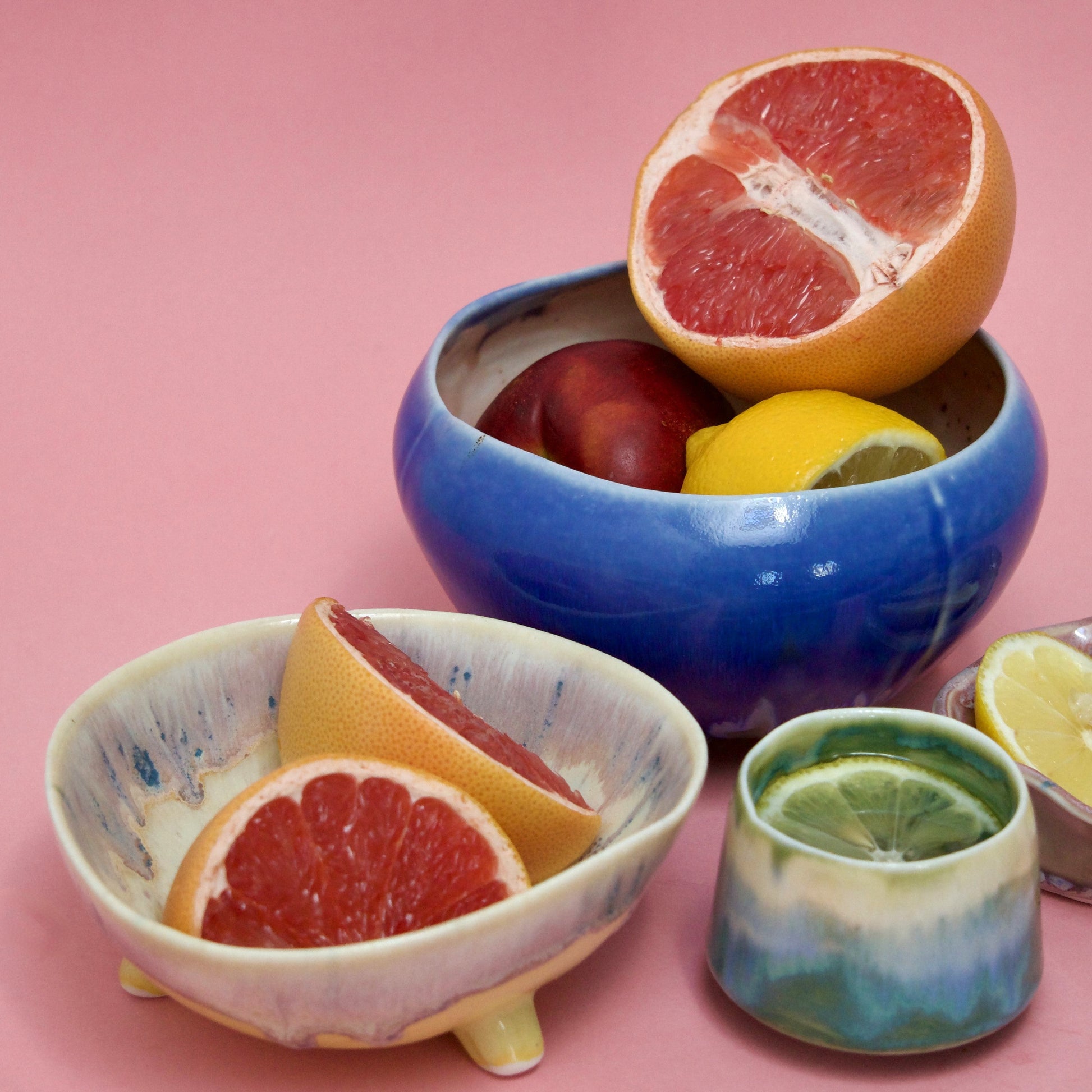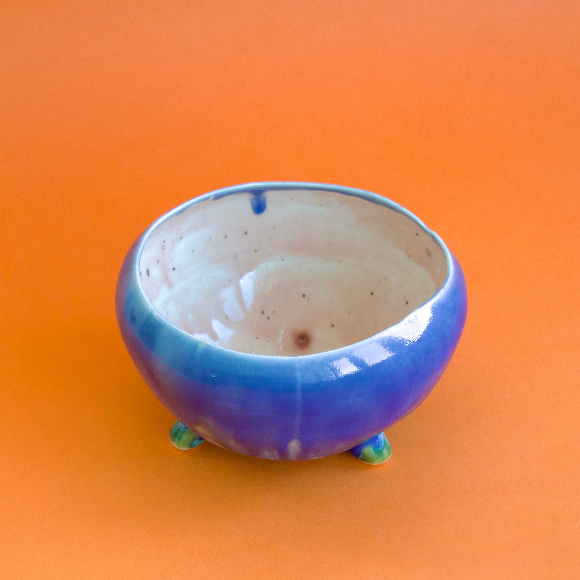 Vas sferic din semi-porţelan , Exteriorul este glazurat în tonuri de albastru cobalt intens, cu scurgeri controlate spre interiorul vasului, iar interiorul în roz pudrat cu picăţele subtile. Ars la peste 1200°C, impermeabil, rezistent.