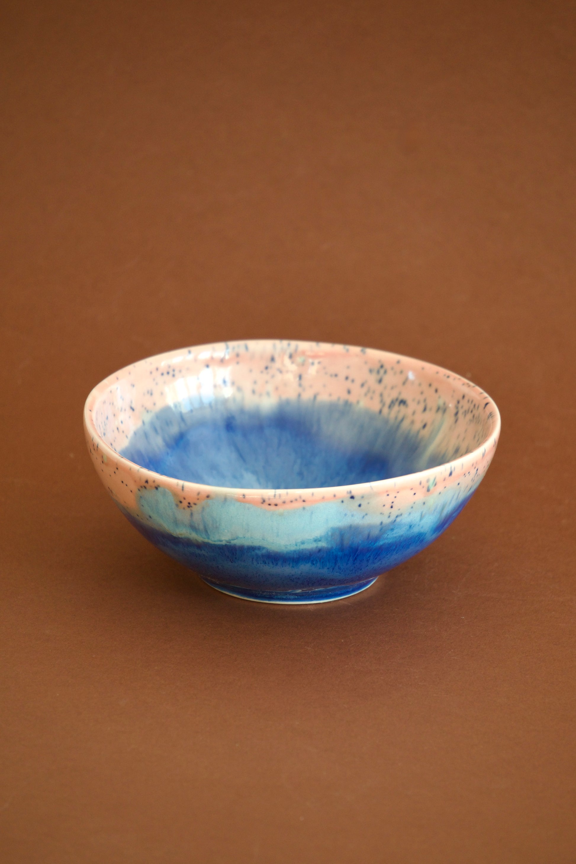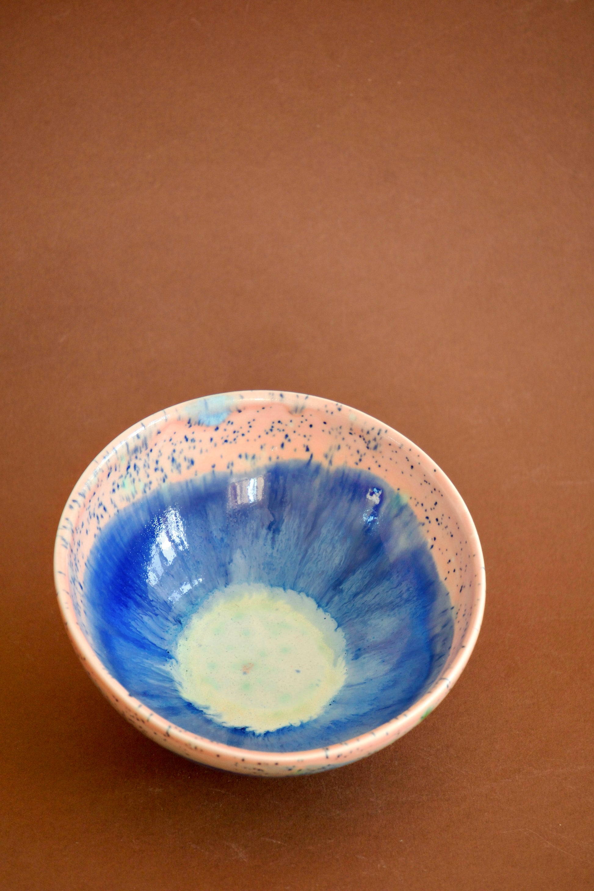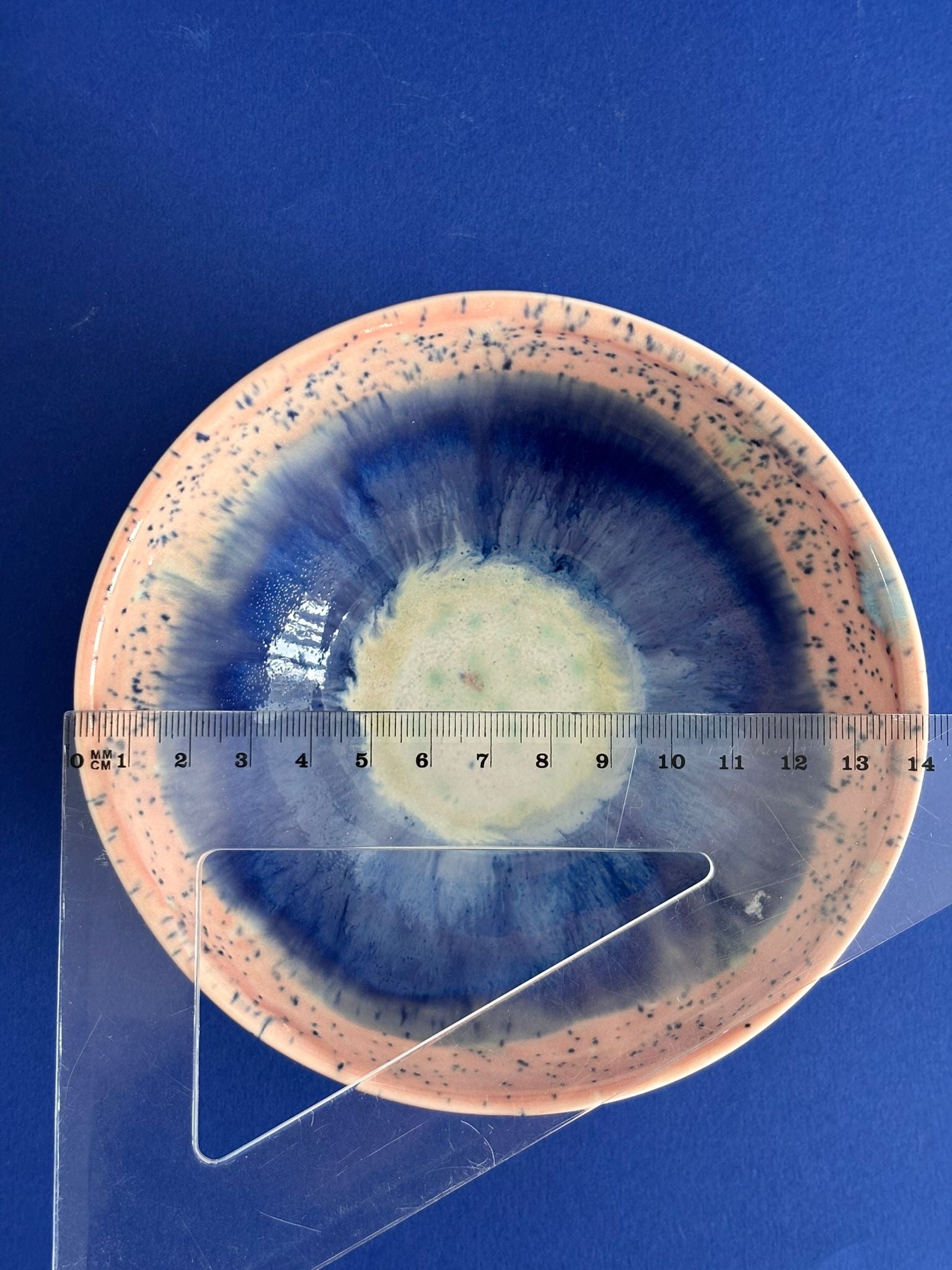 ✔ Culori: tonuri pastelate de albastru, oranj coral și turquoise, interior complet glazurat, exterior în nuanțe de verde pastel și roz