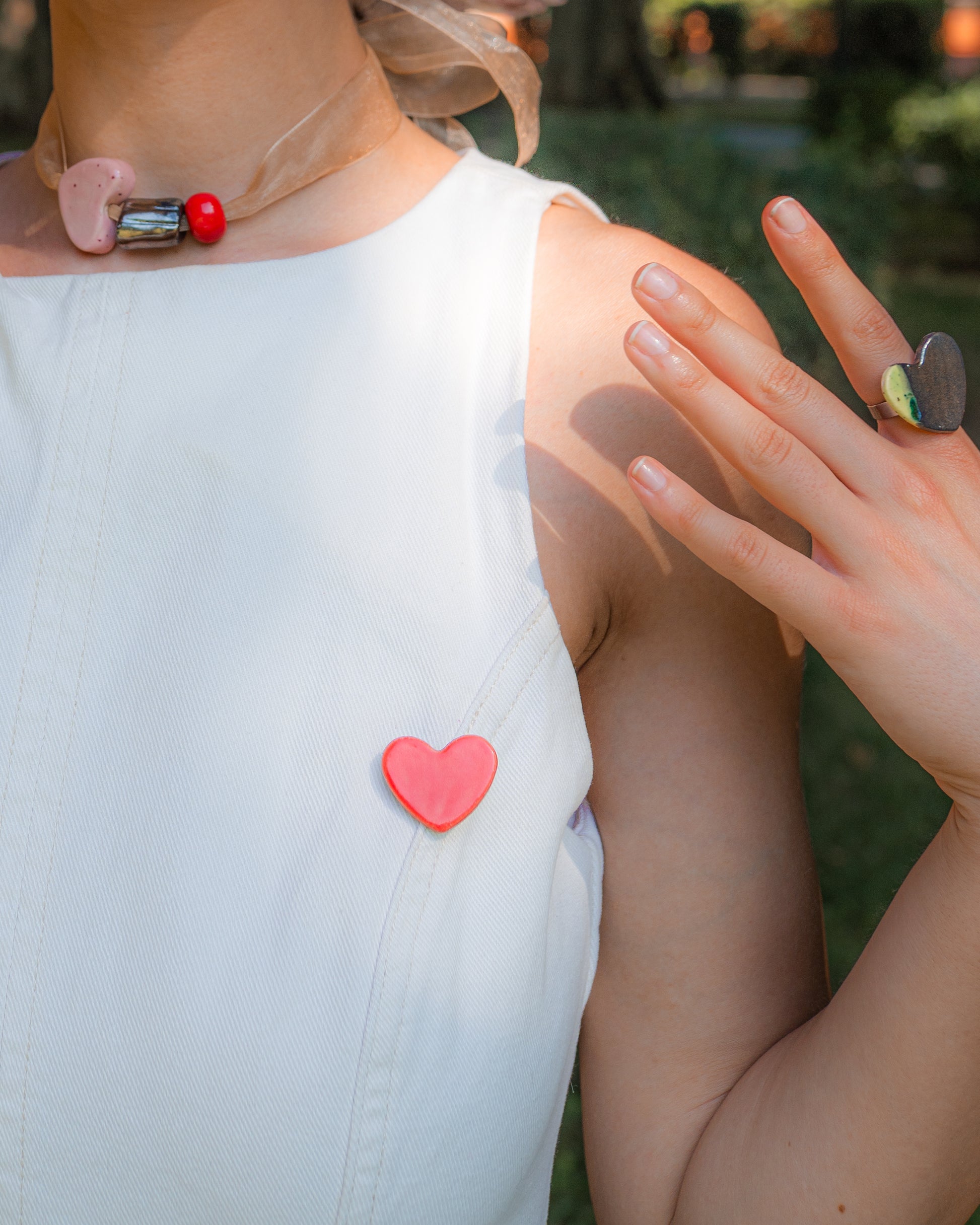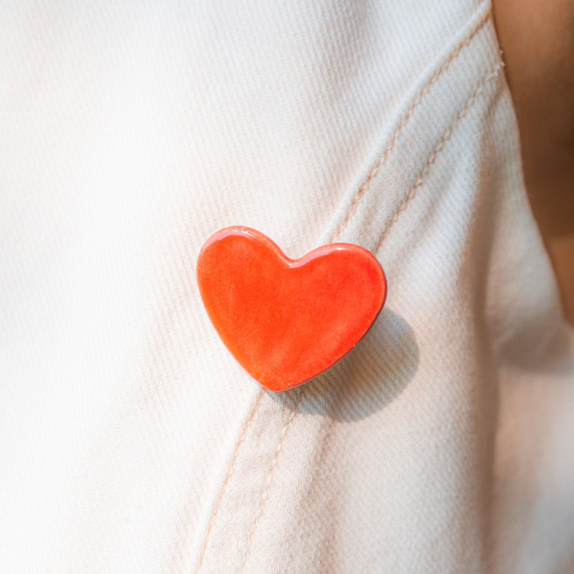 Broșă din ceramică în formă de inimă, arsă la peste 1040°C. Finisaj lucios, glazurat în roșu intens, cu nuanțe subtile care se schimbă în lumină naturală.