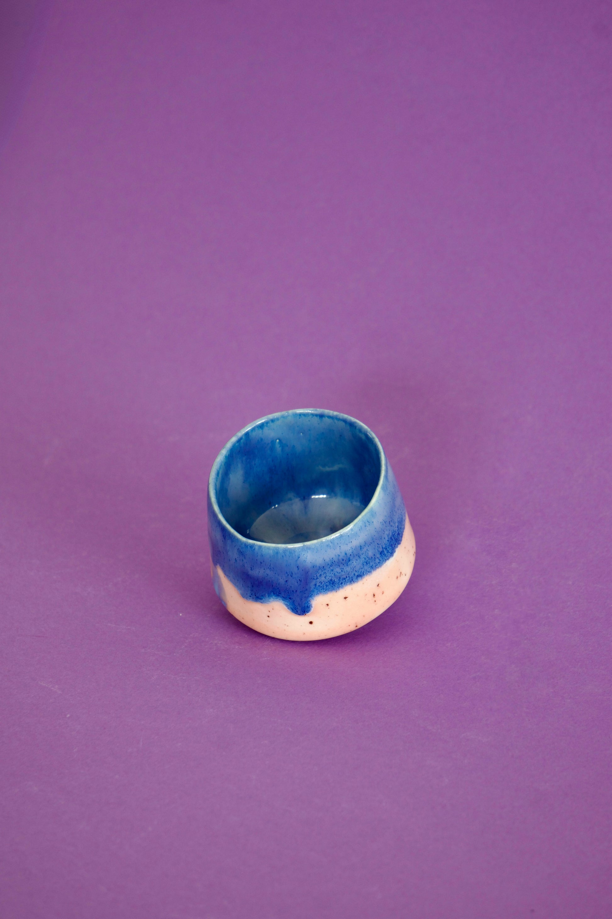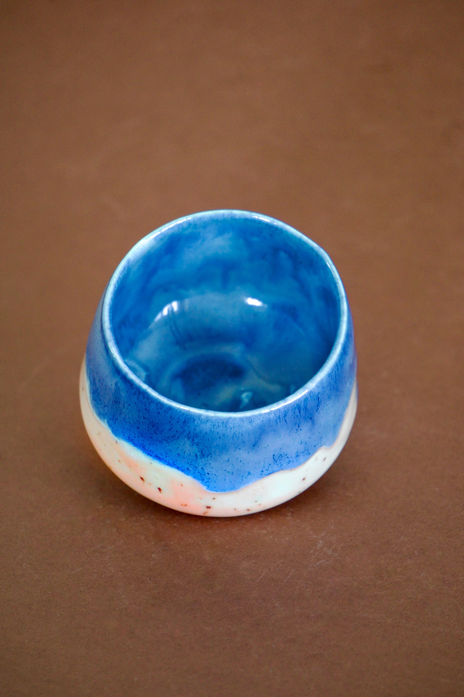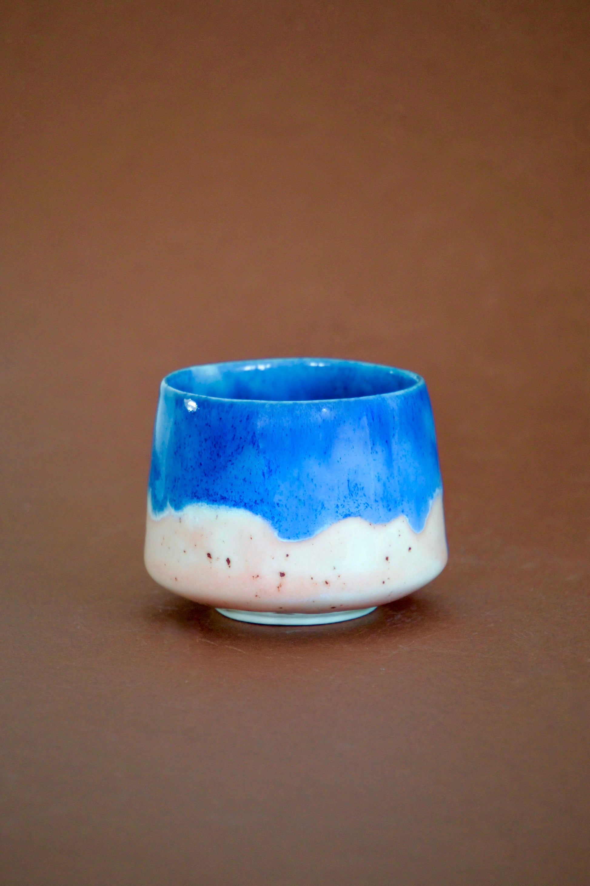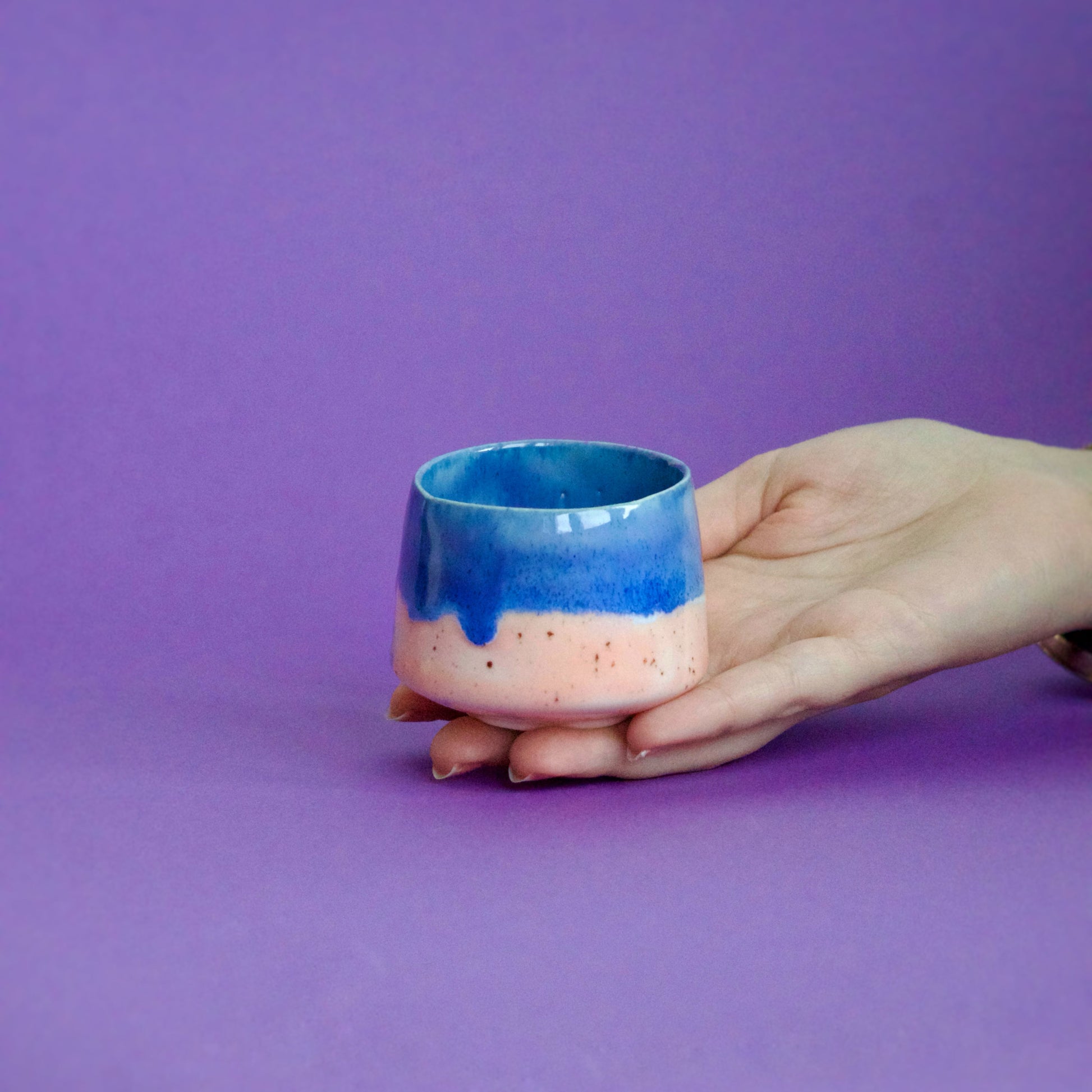 Pahar din semi-porțelan ars la 1200°C, realizat manual în atelierul Ecluze Studio. Exteriorul este glazurat în tonuri pastelate de albastru ultramarin, cu accente în degrade de coral, creând efecte picturale unice. Interiorul este complet glazurat în aceeași nuanță de albastru, pentru un contrast cromatic armonios și elegant.