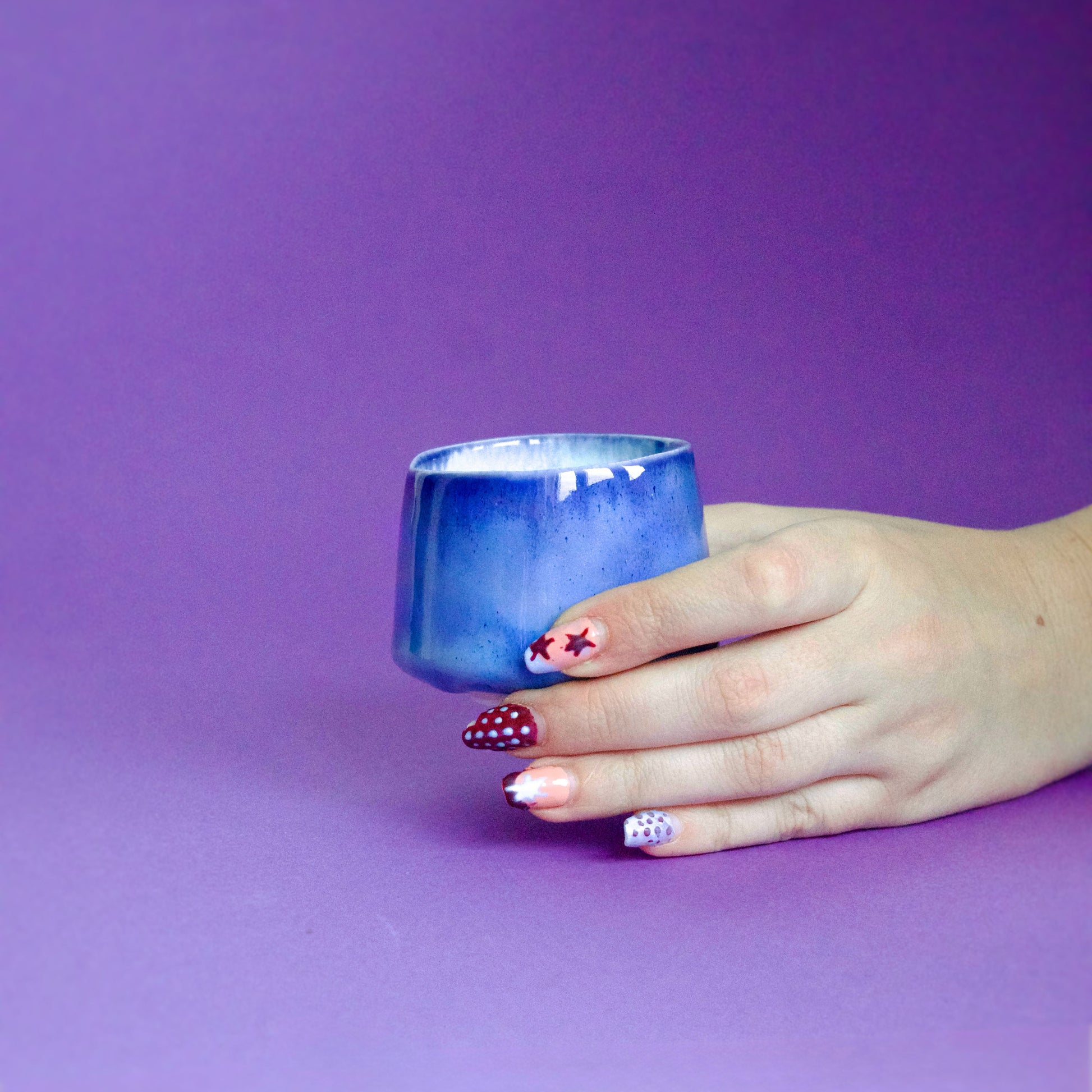 Cană espresso realizată manual din semiportelan, finisată cu glazuri lucioase în nuanțe de albastru ultramarin și verde deschis pastel. Arsă la peste 1200°C pentru rezistență și durabilitate.