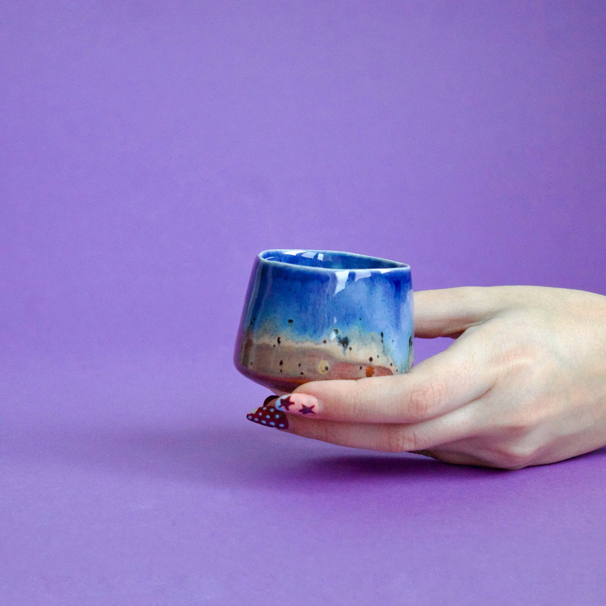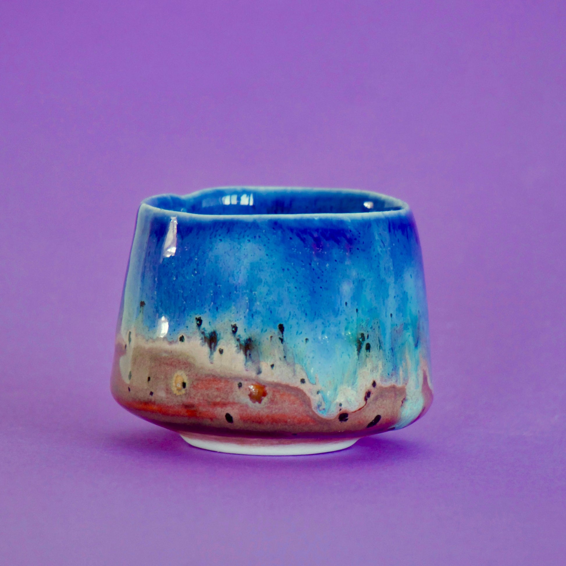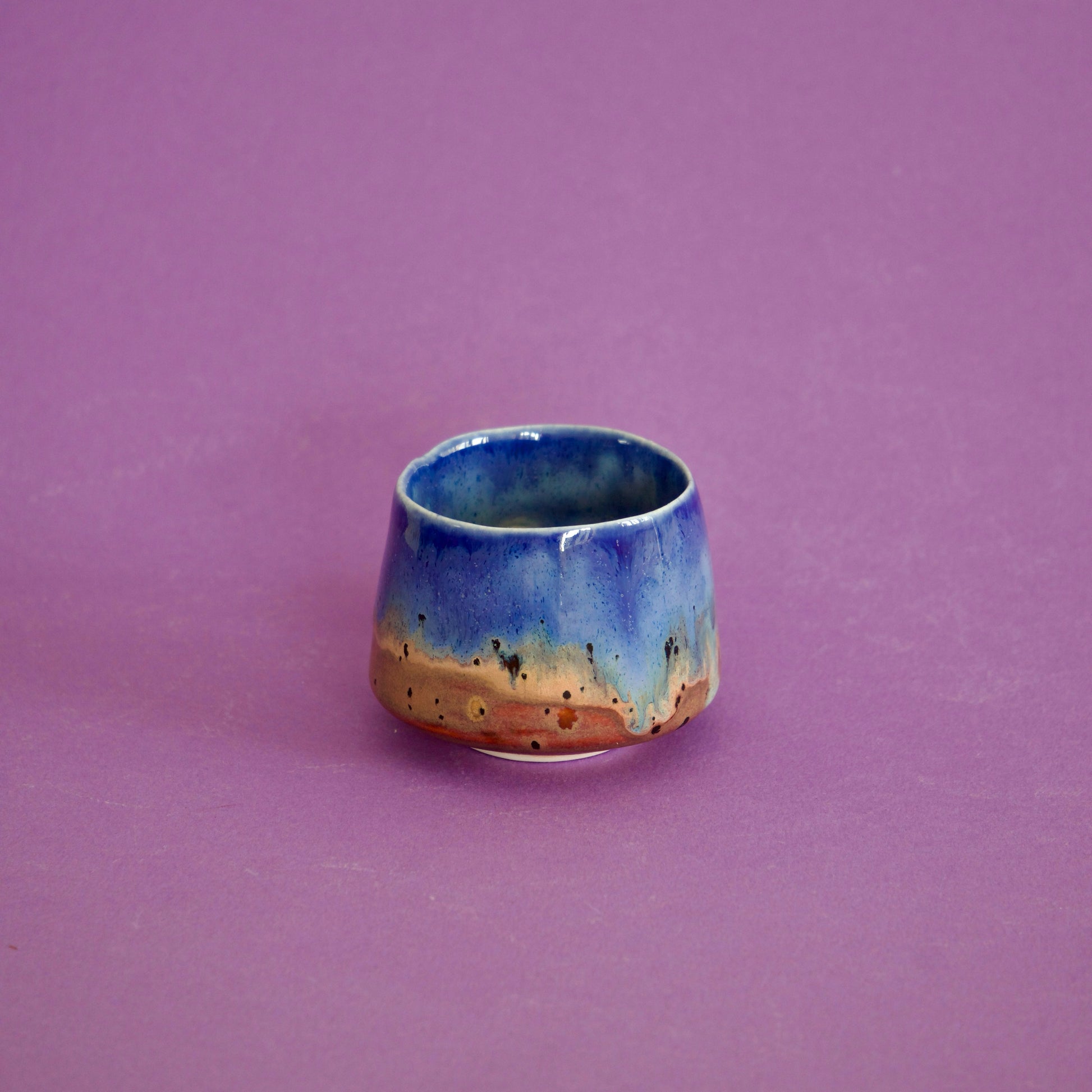 Cană espresso realizată din semi-porțelan ars la 1200°C. Exteriorul este glazurat în nuanțe pastelate de albastru bleu, cu accente degrade brun-sienna, iar interiorul complet glazurat în albastru cobalt creează un contrast armonios.