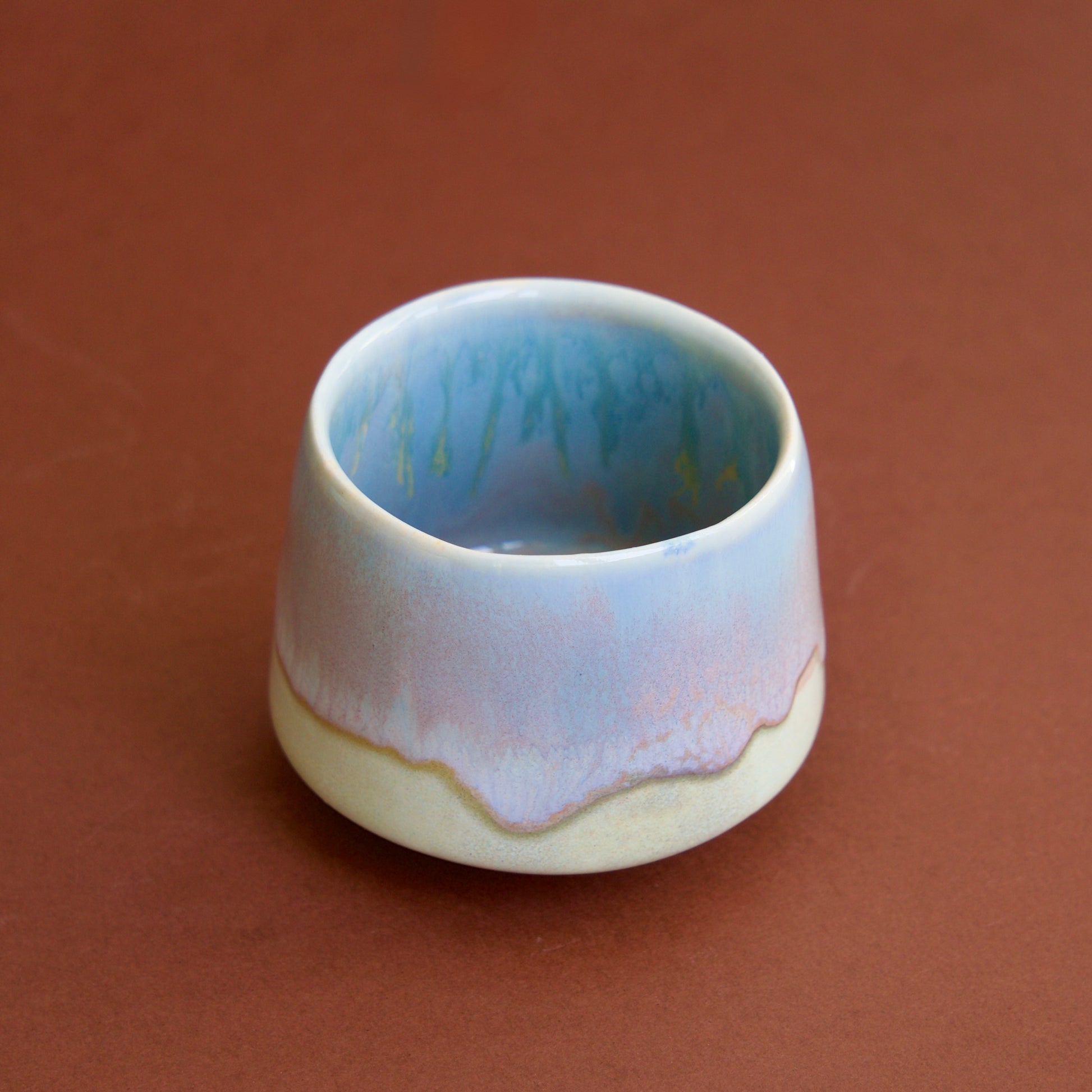 Cană espresso din semi-porțelan, arsă la peste 1200°C pentru rezistență și durabilitate. Finisată manual cu glazuri lucioase în nuanțe calde de terracotta și roz subtil, cu variații naturale de culoare.