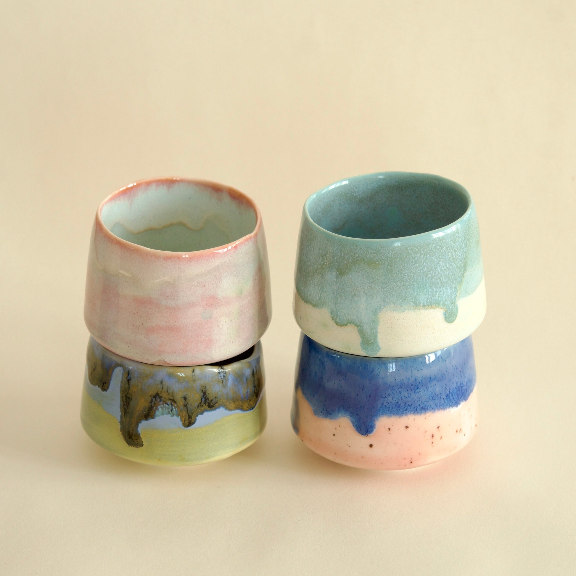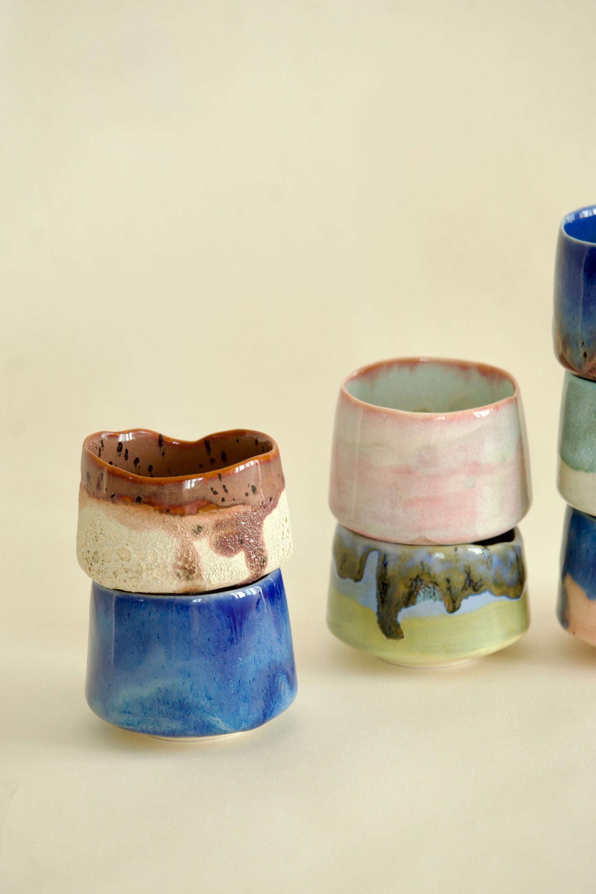 Cană espresso realizată manual din semiportelan, finisată cu glazuri lucioase în nuanțe de verde deschis pastel și roz difuz. Arsă la peste 1200°C pentru rezistență și durabilitate. Fiecare piesă este unicat, cu variații subtile de culoare.