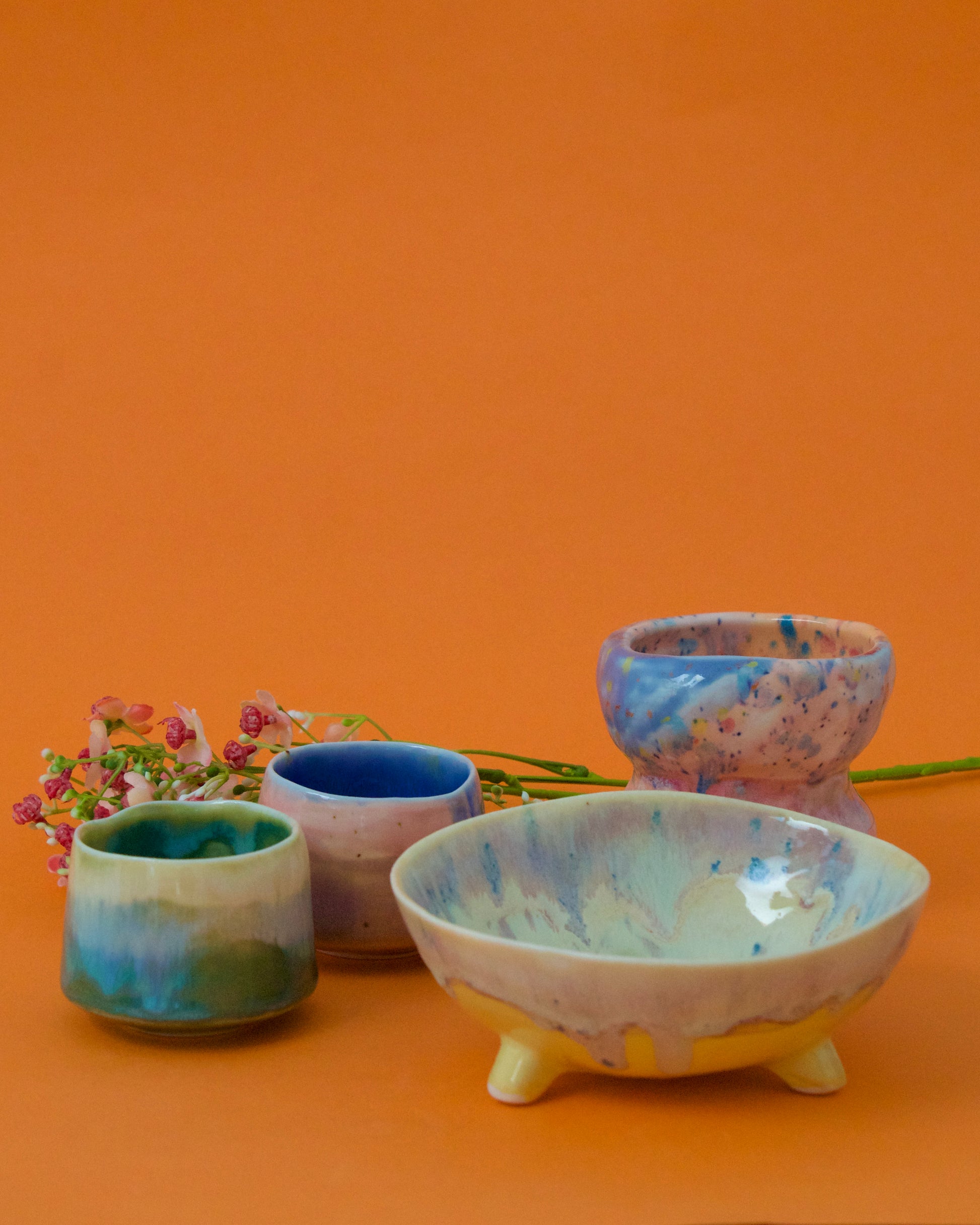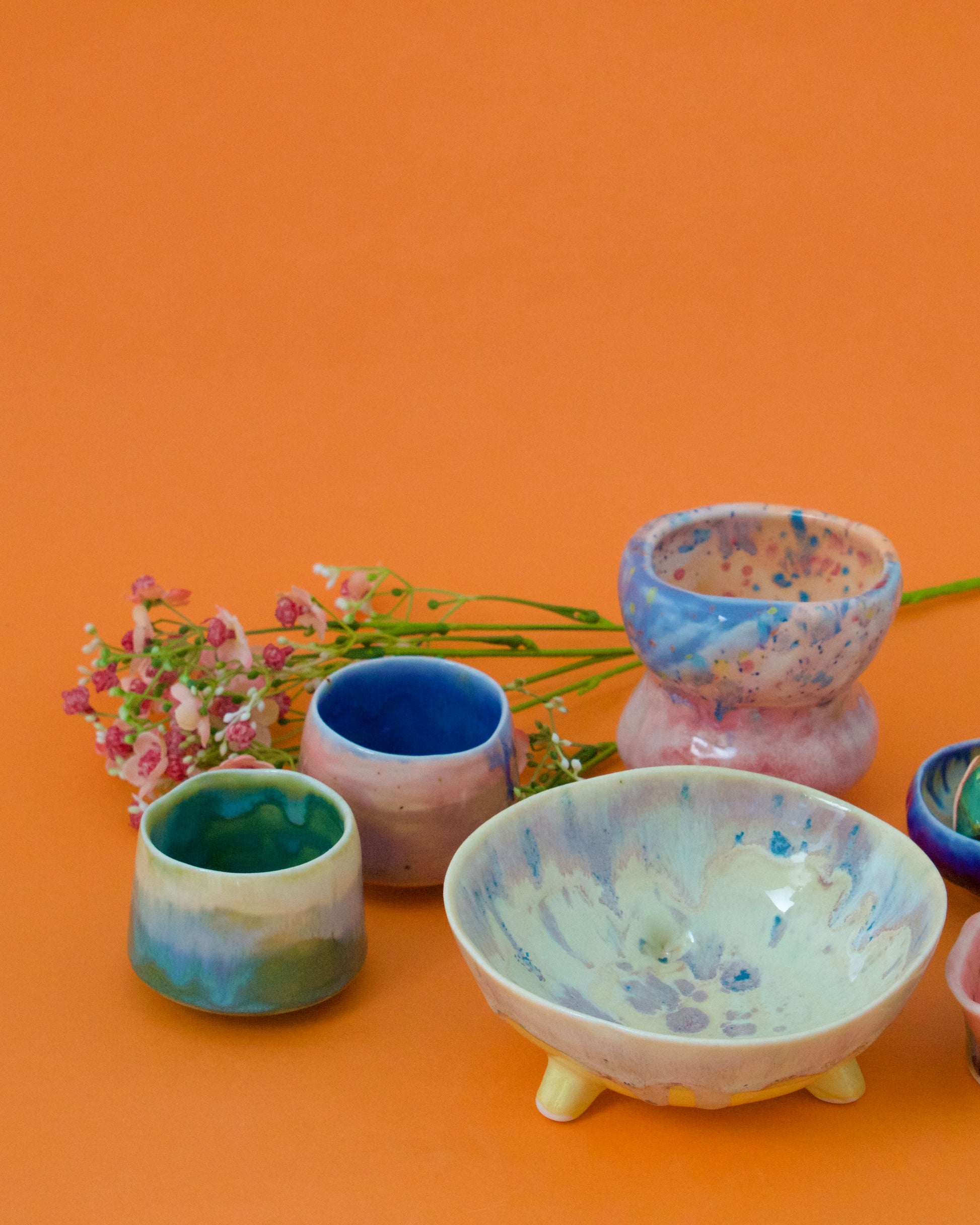 Piesă compusă, modelată din semi-porțelan și arsă la 1200°C. Interior glazurat în roz pudră deschis, presărat cu puncte multicolore în nuanțe pastelate, oranj, mov și roz. Exteriorul este acoperit cu glazuri în degradeuri, aplicate în straturi vizibil picturale.