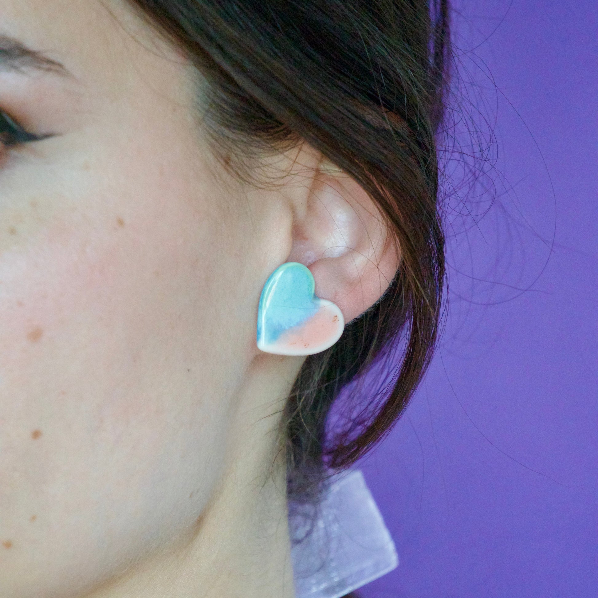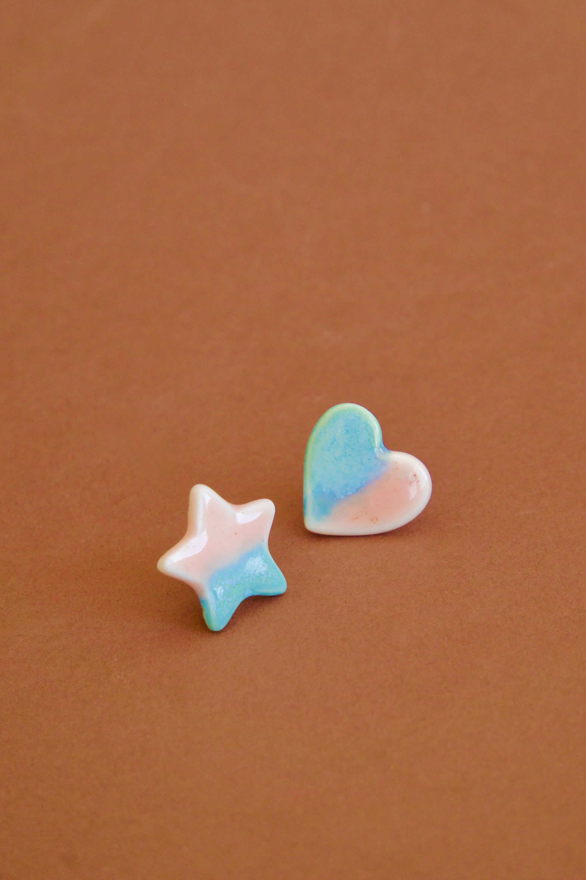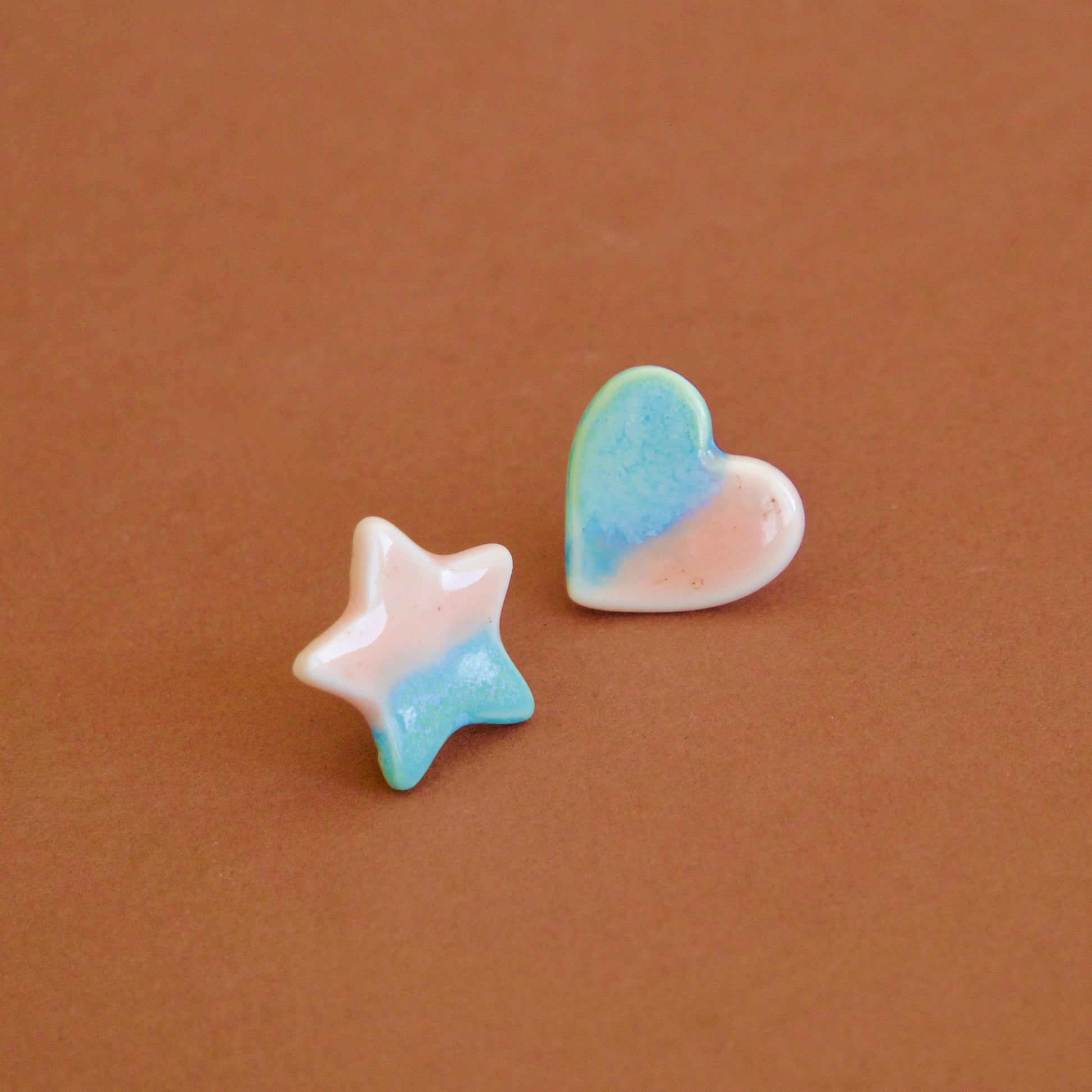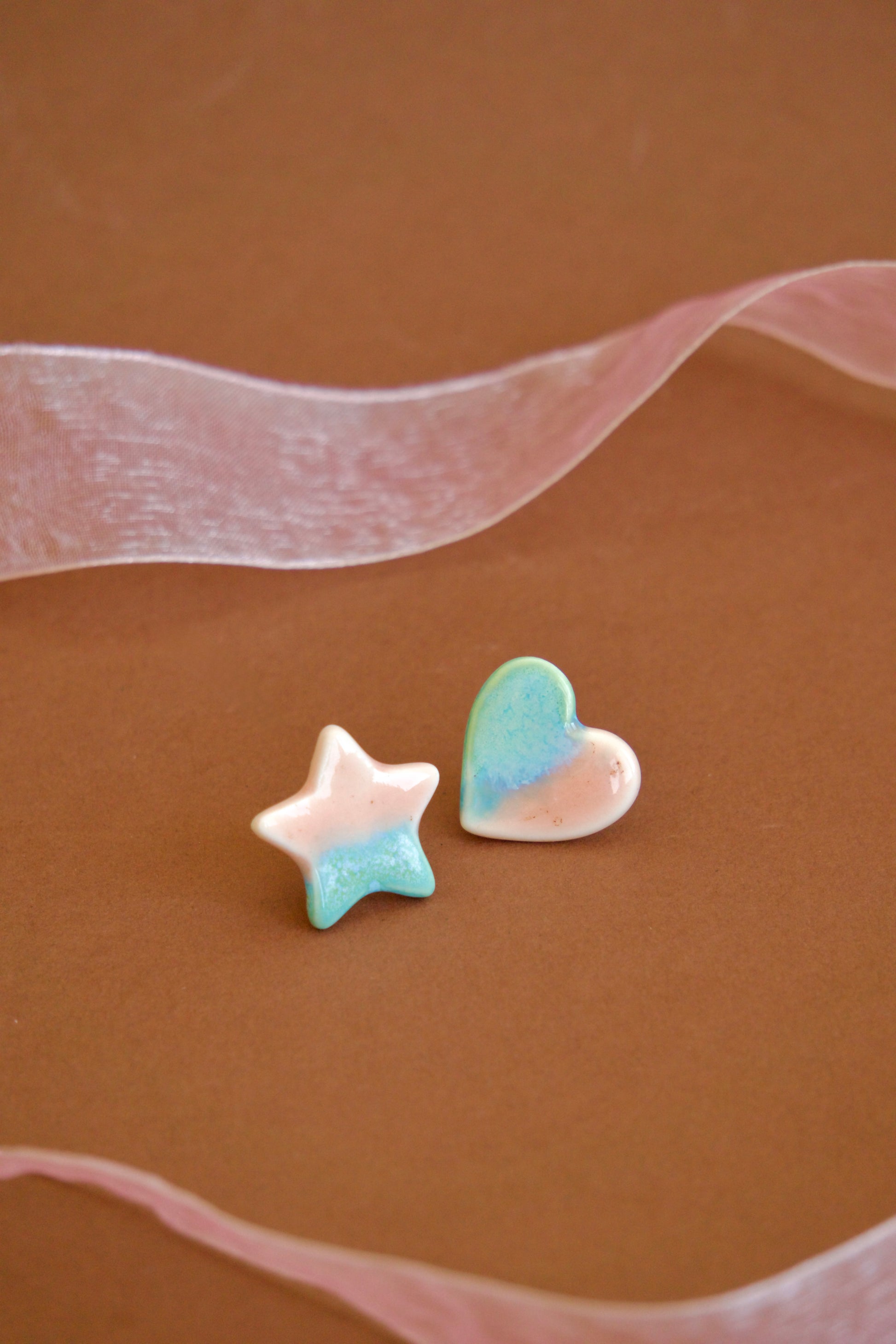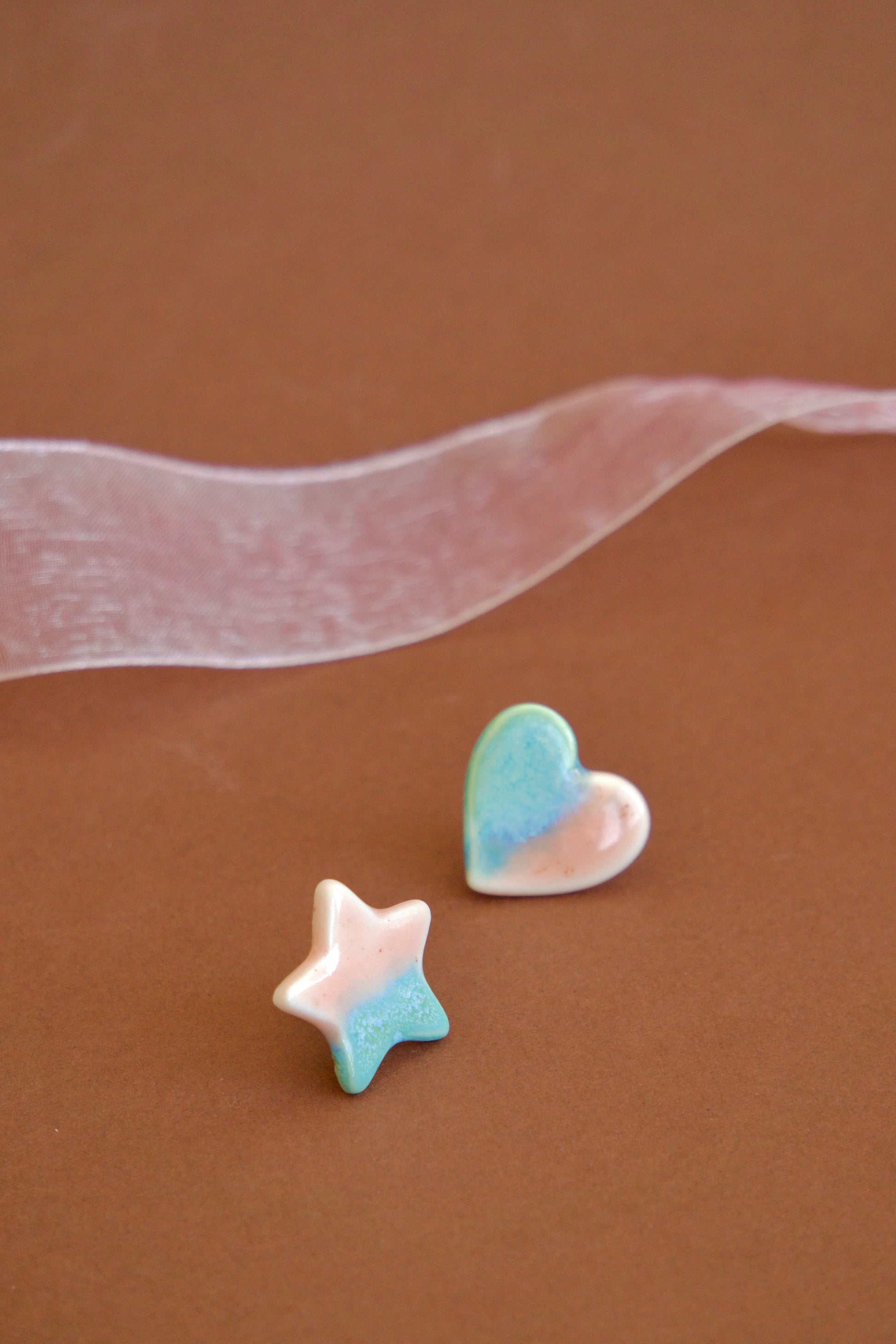 Cercei handmade din porțelan în formă de stea/inimă, cu finisaj bleu turqoise și accente rozalii. Realizați manual, arși la 1200°C pentru rezistență și durabilitate.