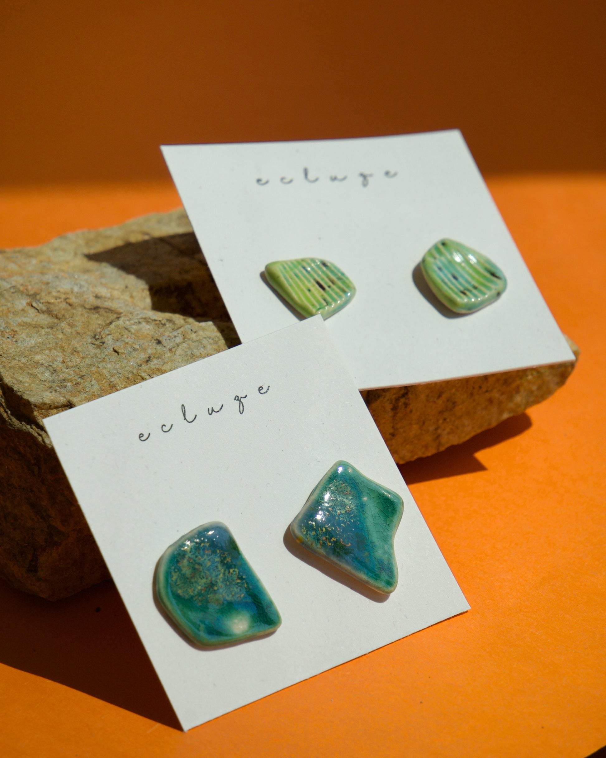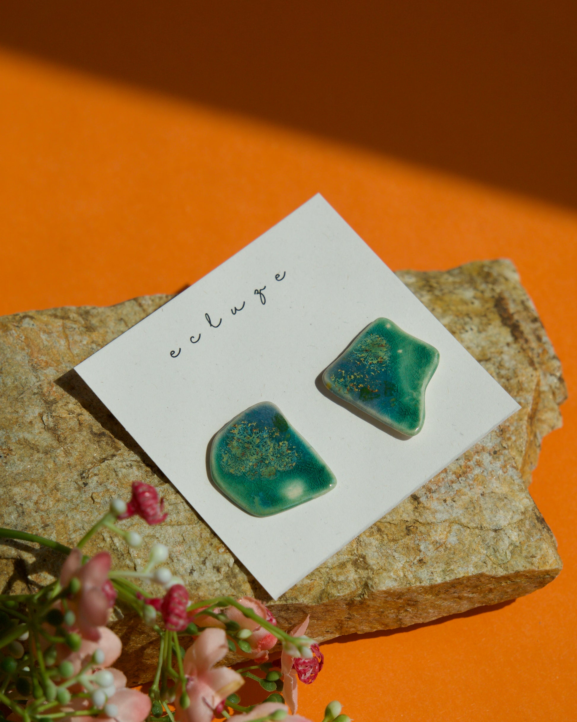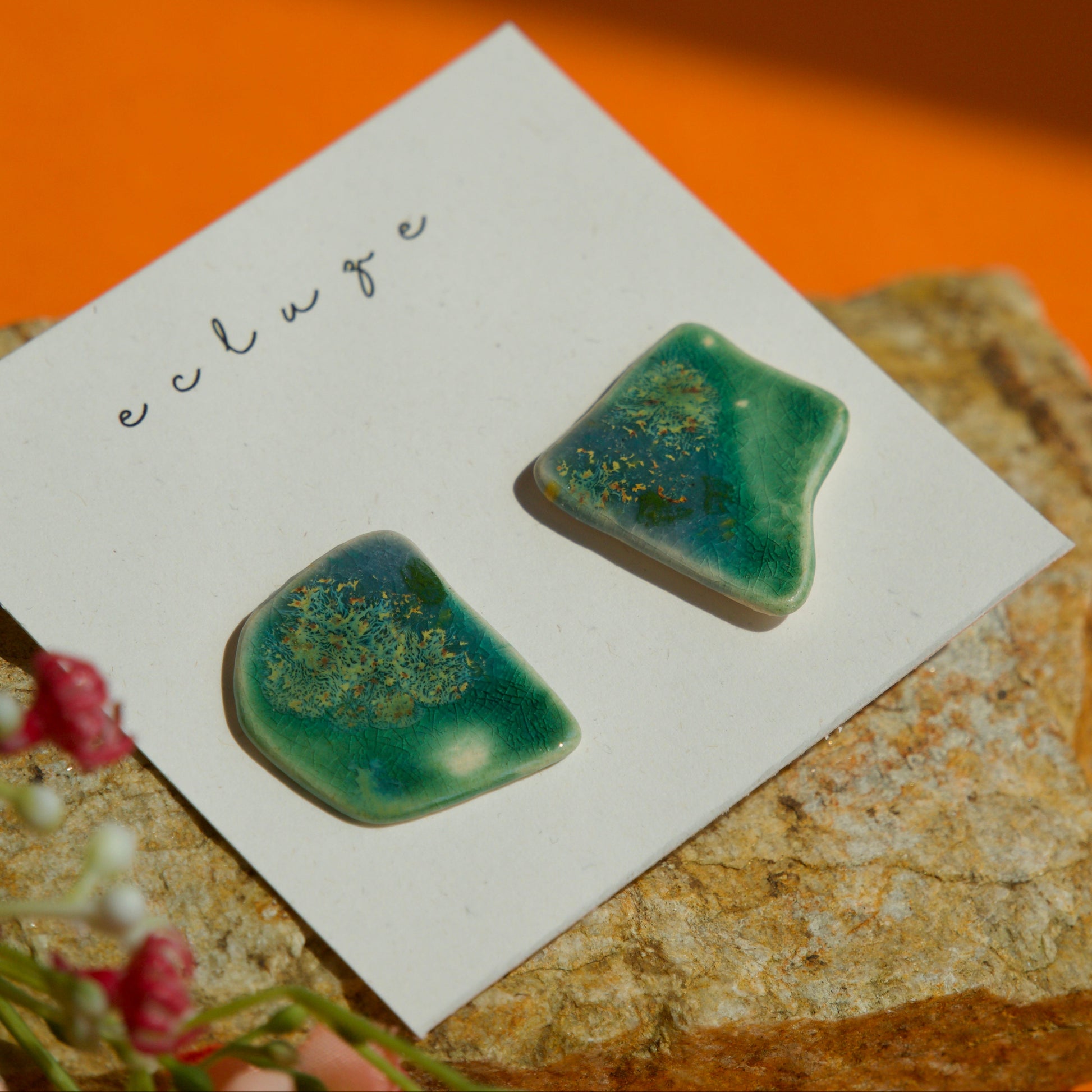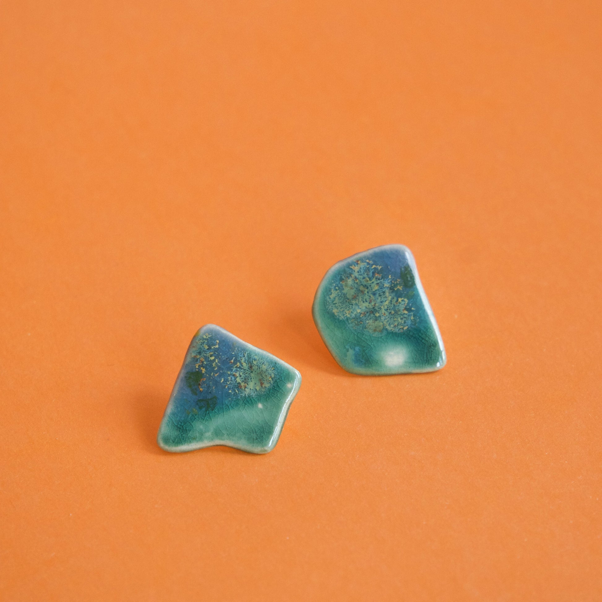 Cercei din ceramică, în formă organică, asimetrică. Arși la peste 1040°C. Glazura aduce nuanțe de verde marin și albastru adânc, cu mici inserții aurii care amintesc de structuri vegetale sau minerale.