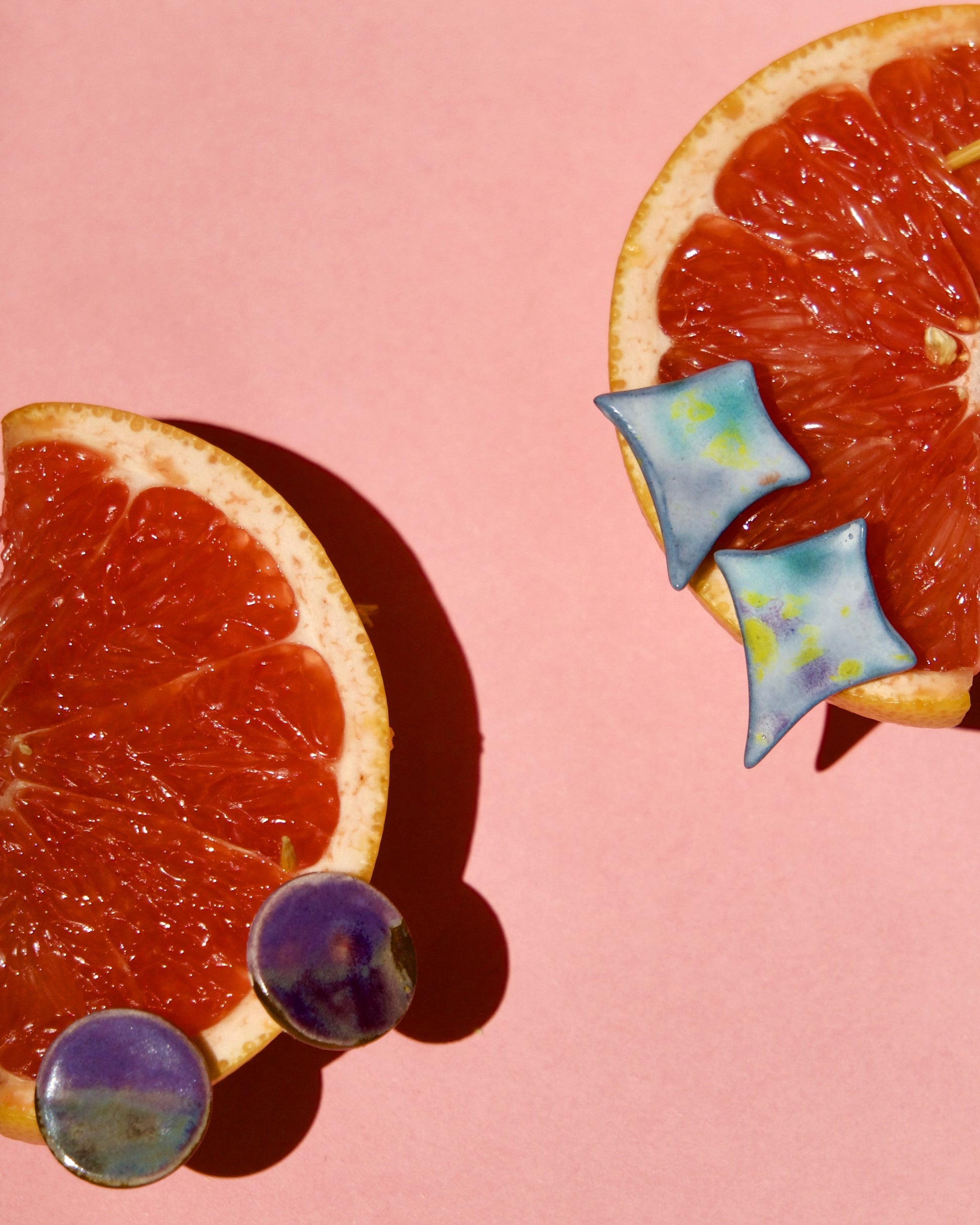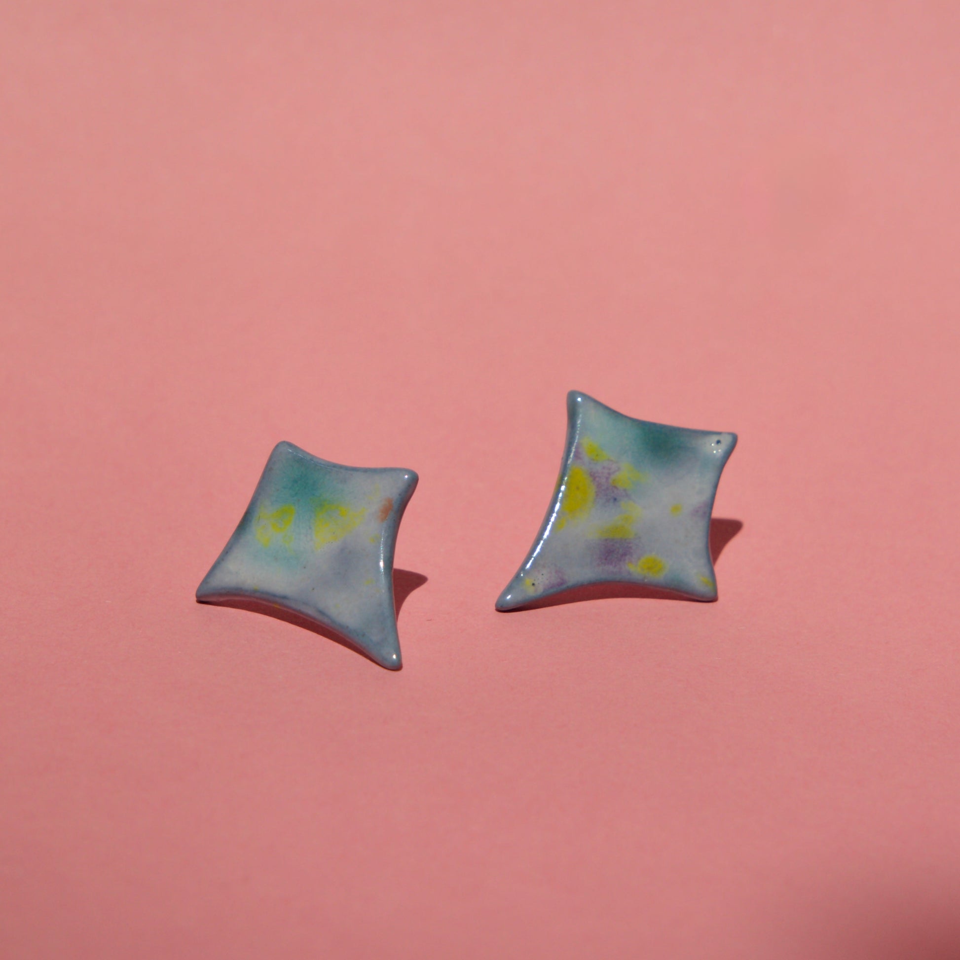Cercei rotunjiți sub formă de romb neregulat, modelați manual și arși la peste 1040°C. Suprafețele sunt acoperite cu glazuri în tonuri reci de albastru, verde pal și accente galbene, cu variații de culoare ce se schimbă subtil în lumină.