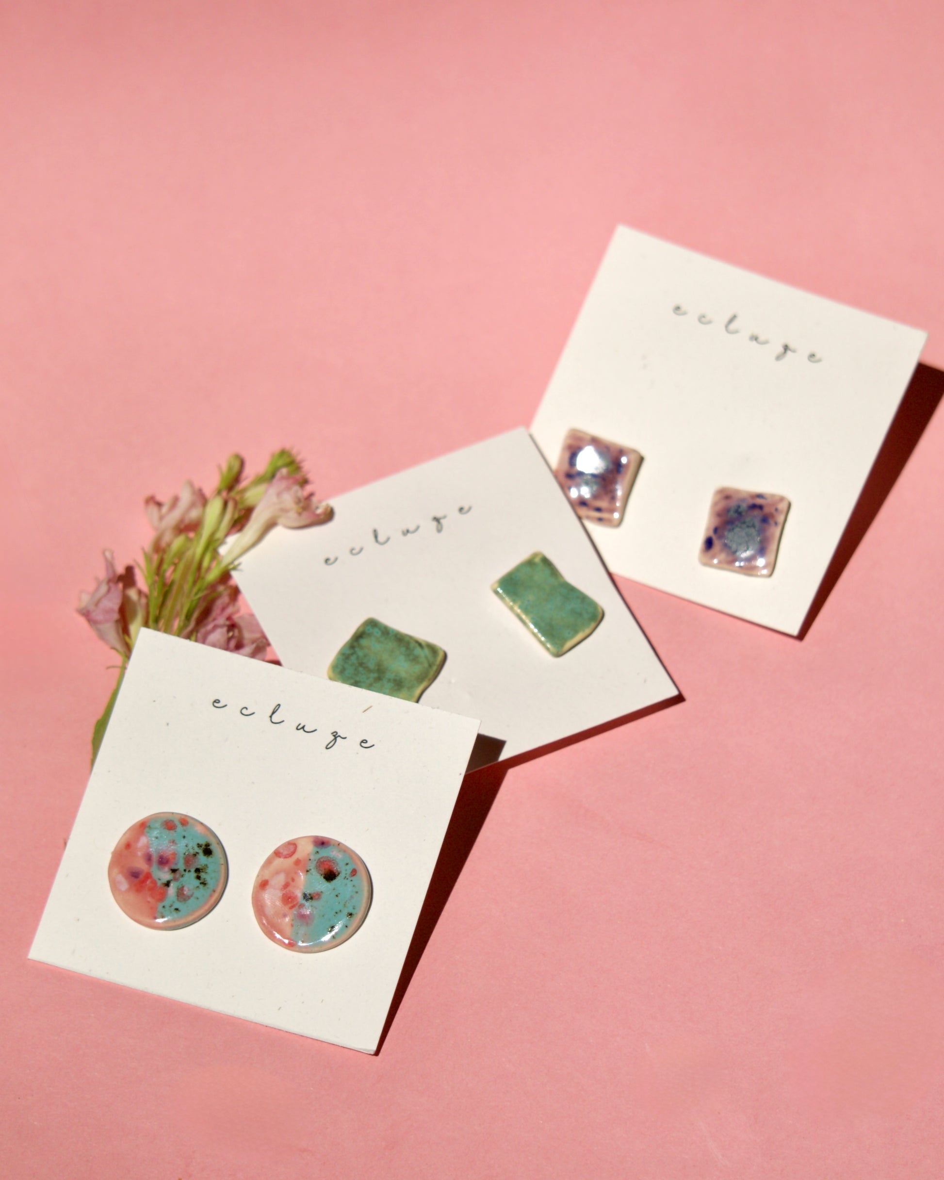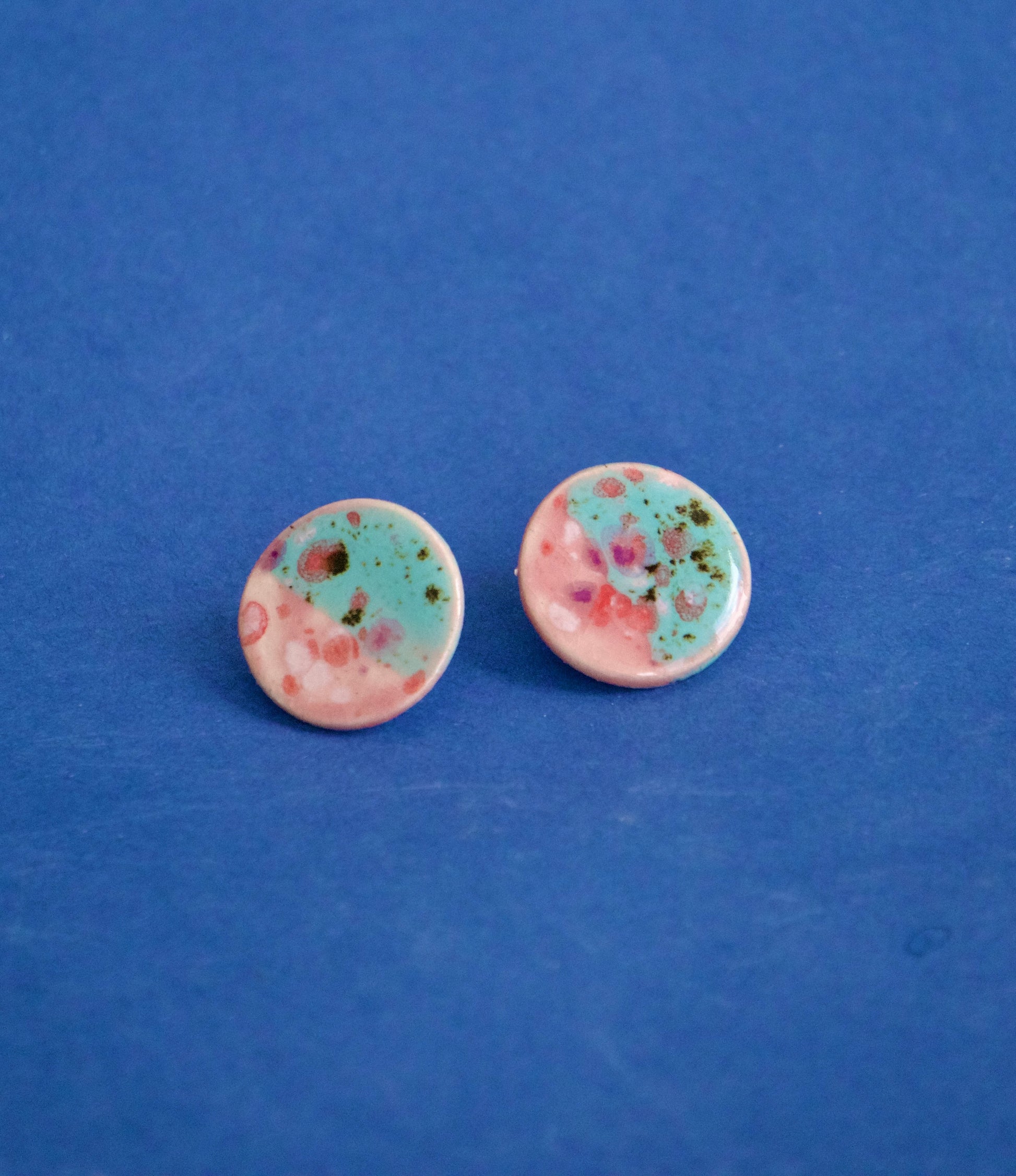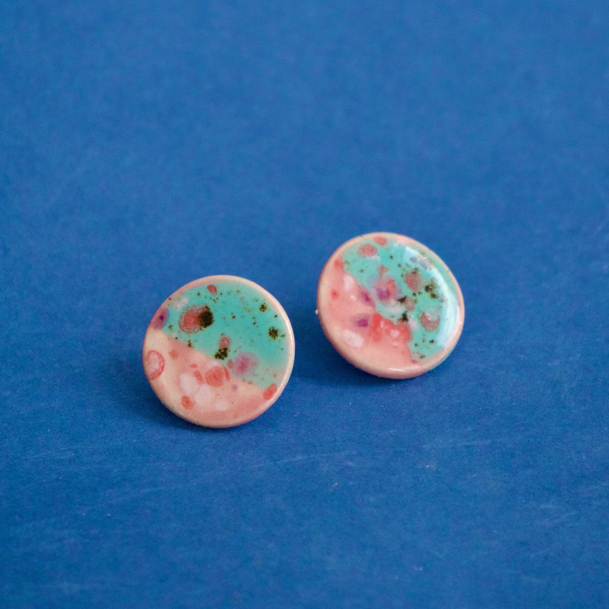 Cercei din ceramică, model rotund, arși la peste 1040°C. Glazură fluidă în nuanțe de turcoaz, roz pal și accente picturale în purpuriu și verde măsliniu, cu o textură vizuală organică.