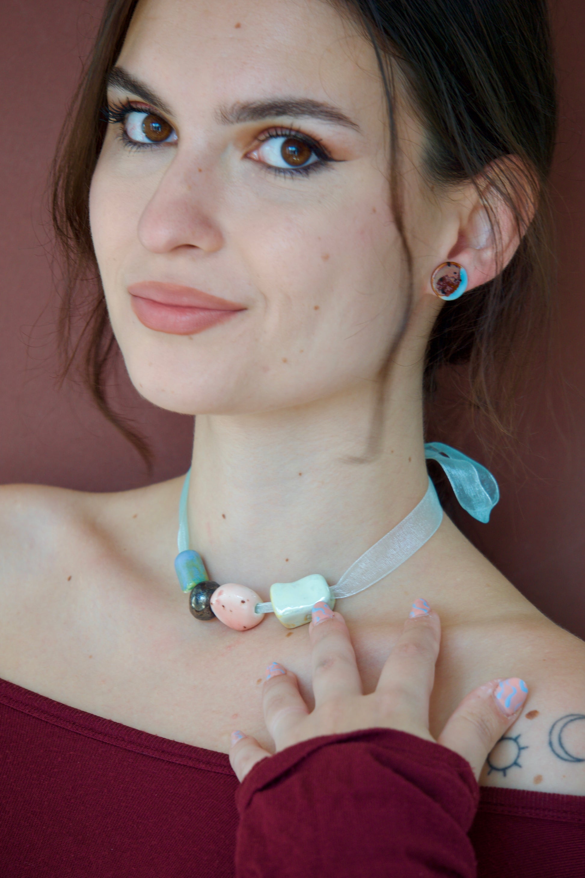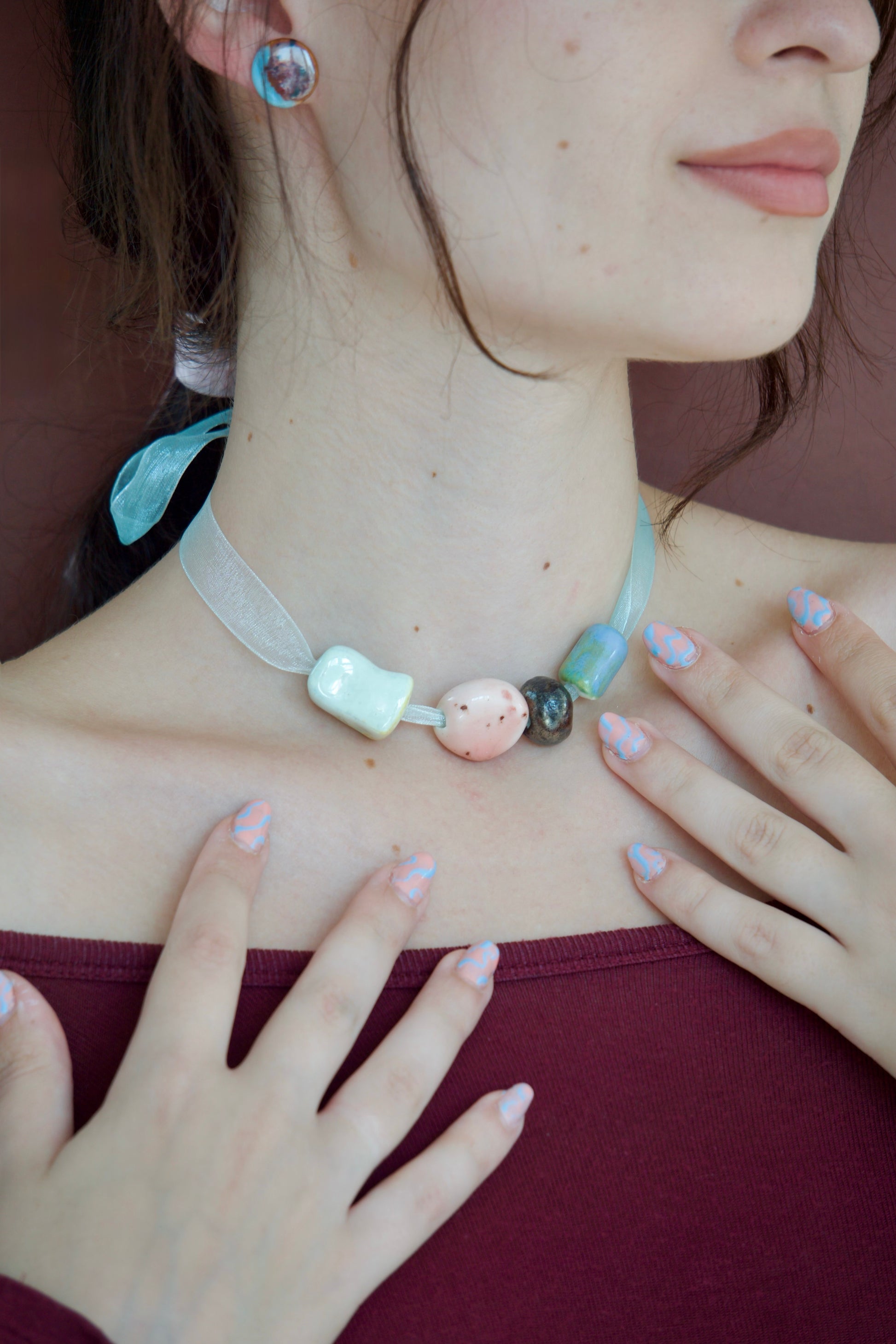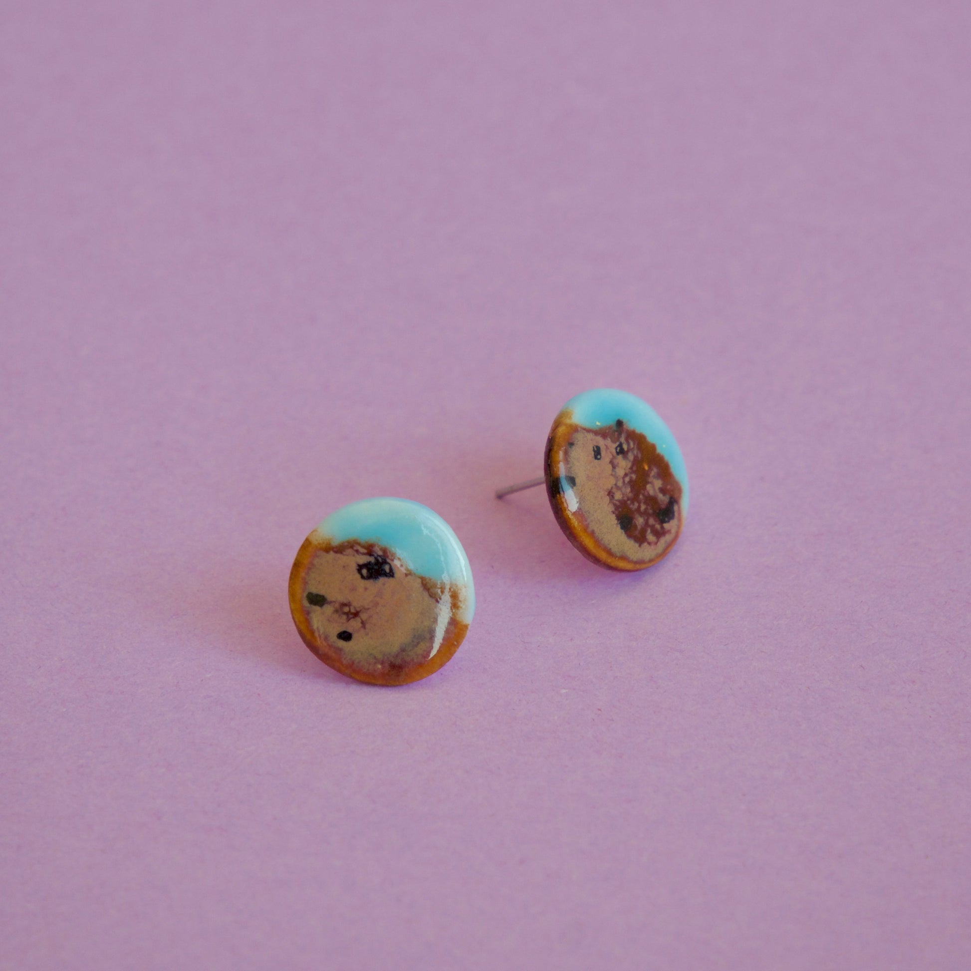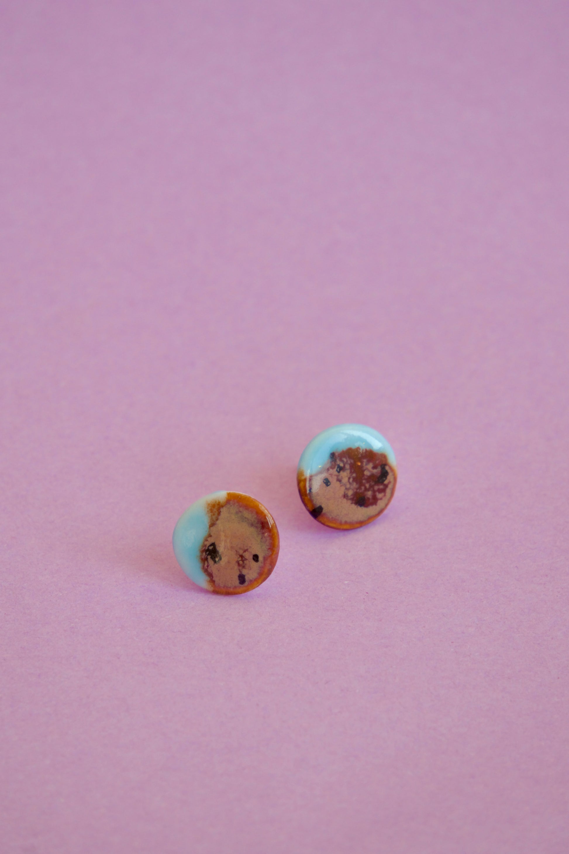 Cercei rotunzi din porțelan glazurați în nuanțe saturate de bleu ciel și brun cu picățele negre.