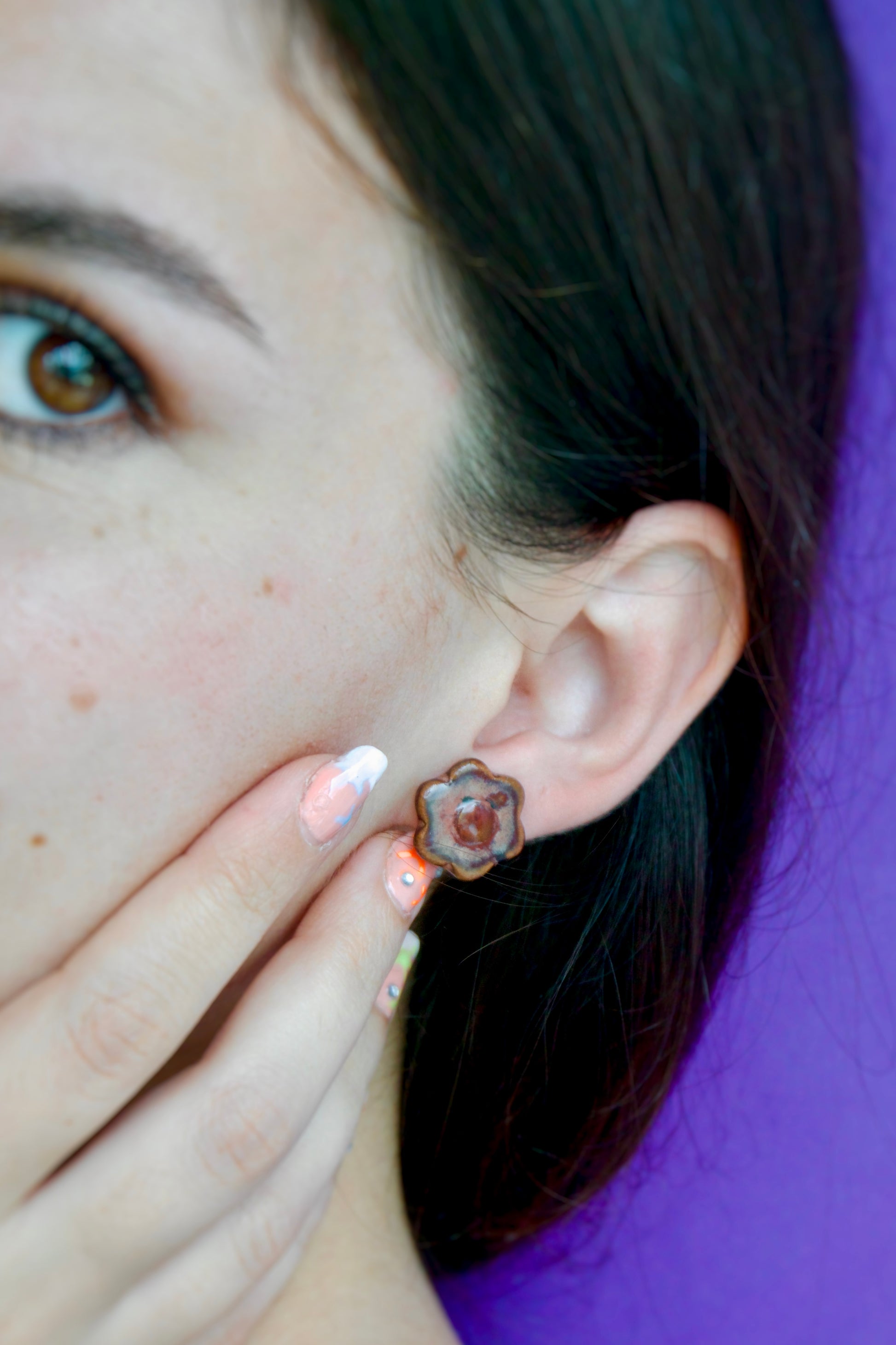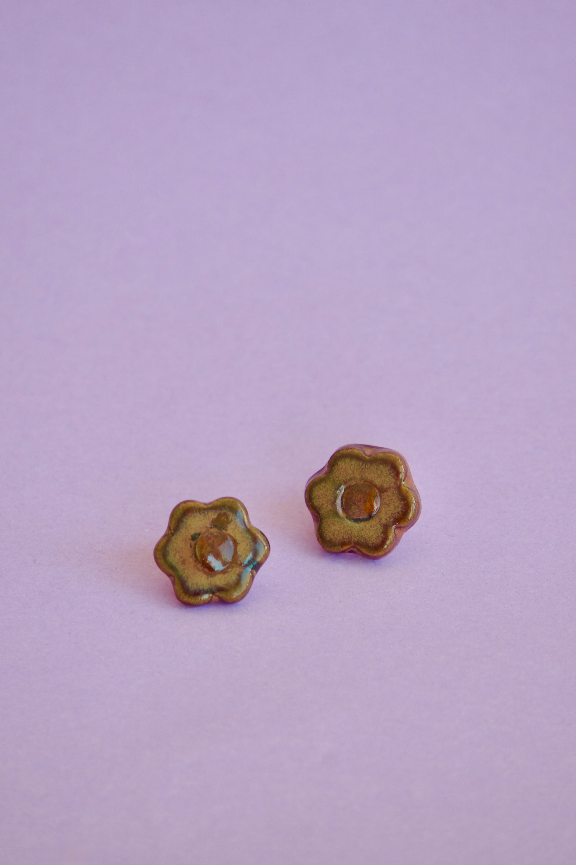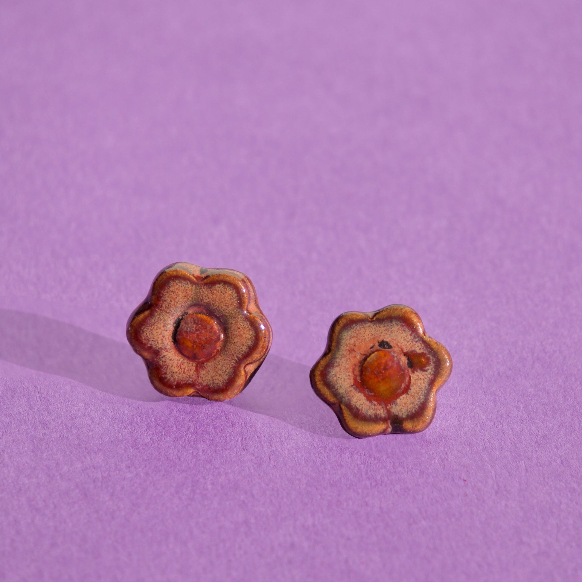 Cercei în forme jucăușe de flori cu glazuri în nuanțe de sienna arsă. Fiecare pereche este unică, cu diferențe subtile în formă și culoare. Arși la peste 1040°C pentru durabilitate crescută.