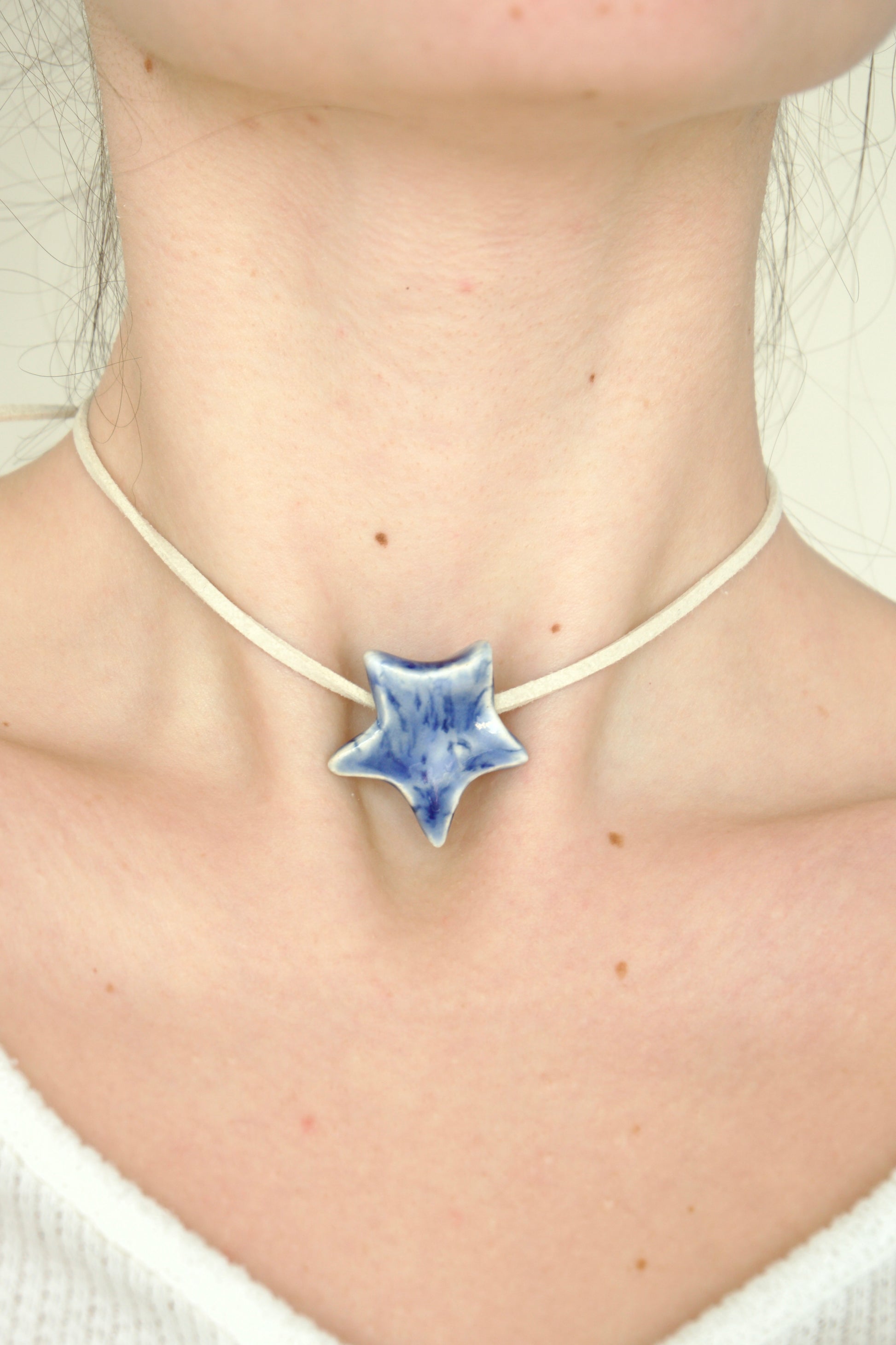 Charm din ceramică – Stea Albastru Perlat cu șnur suede bej | Ecluze Studio
