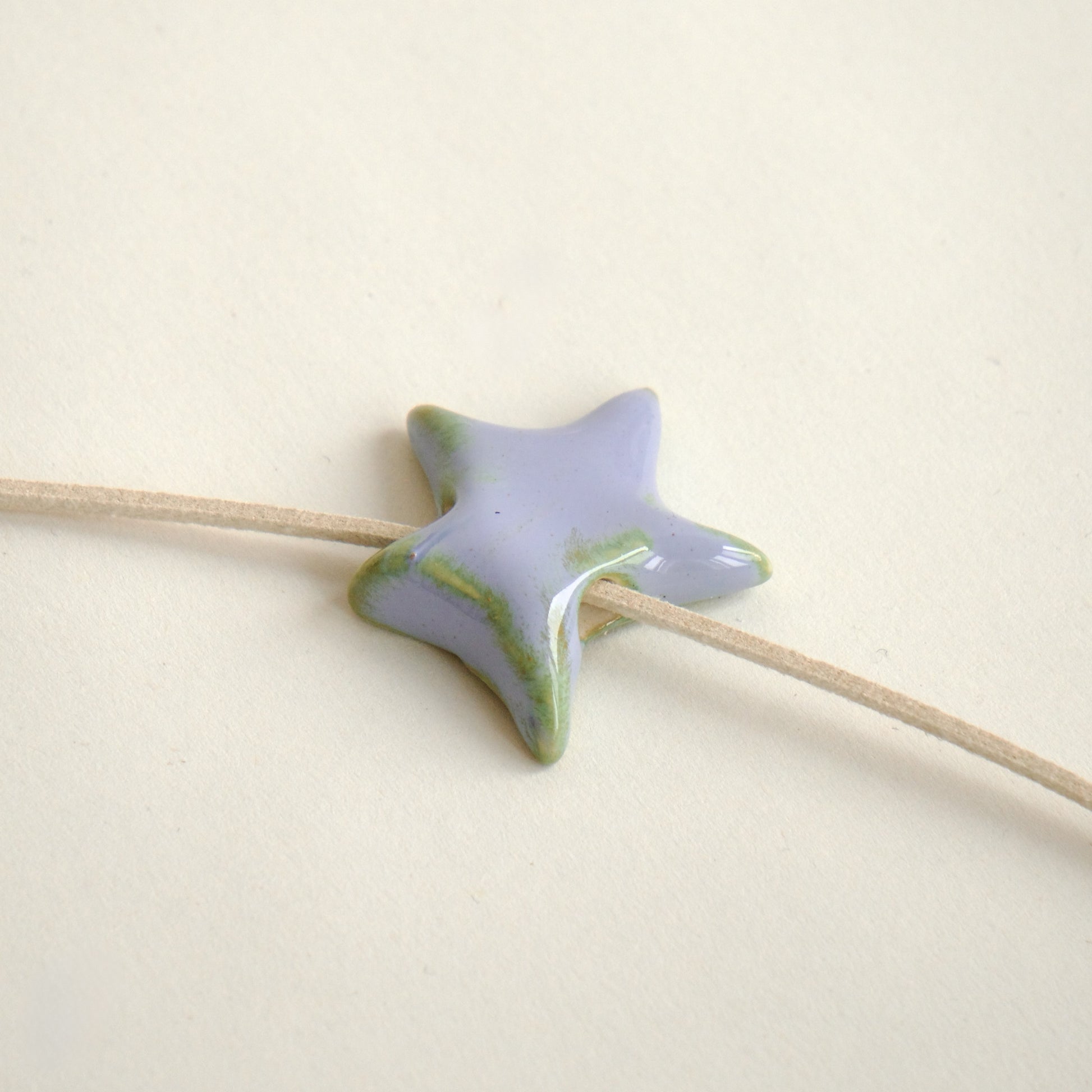 Charm handmade din ceramică în formă de stea, finisat manual cu glazuri lila, bleu și accente subtile verzi pentru un efect cromatic elegant.