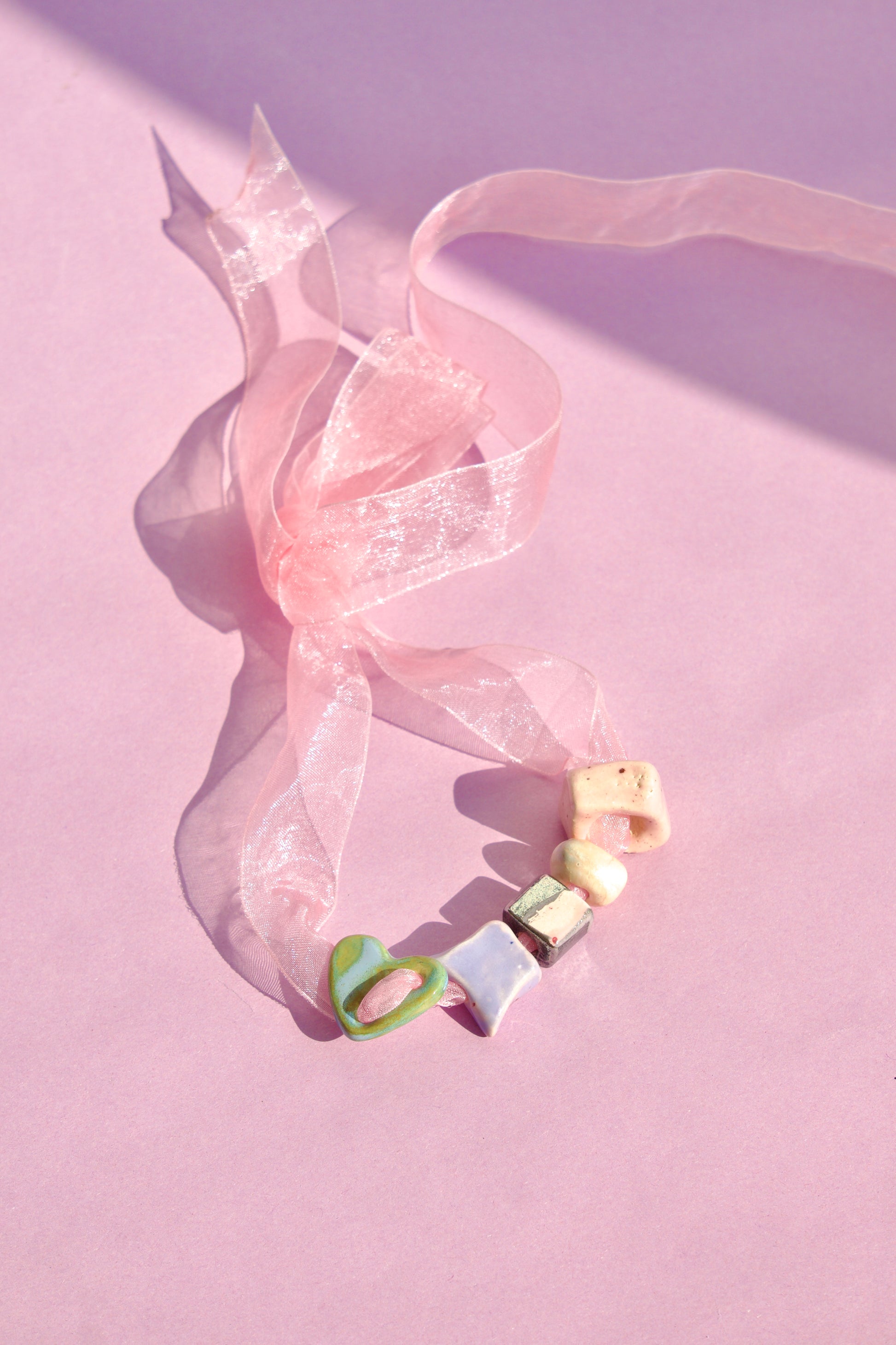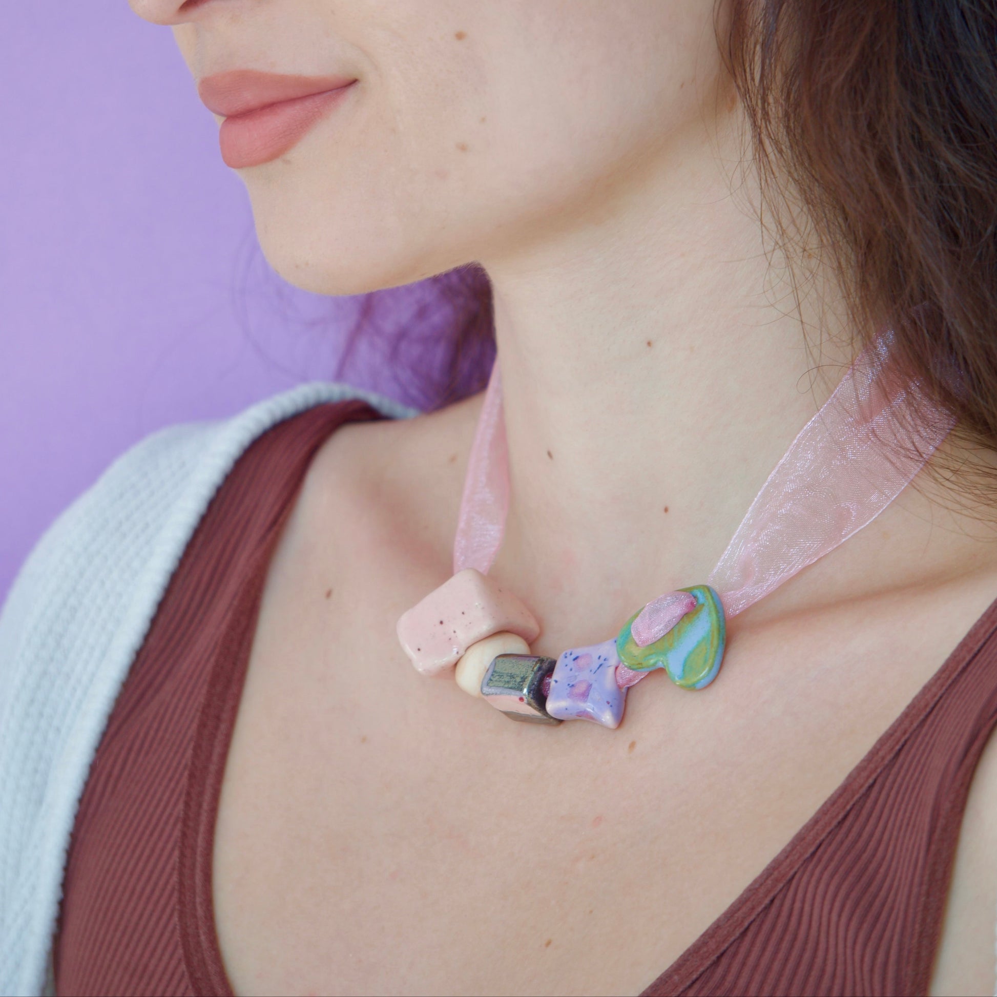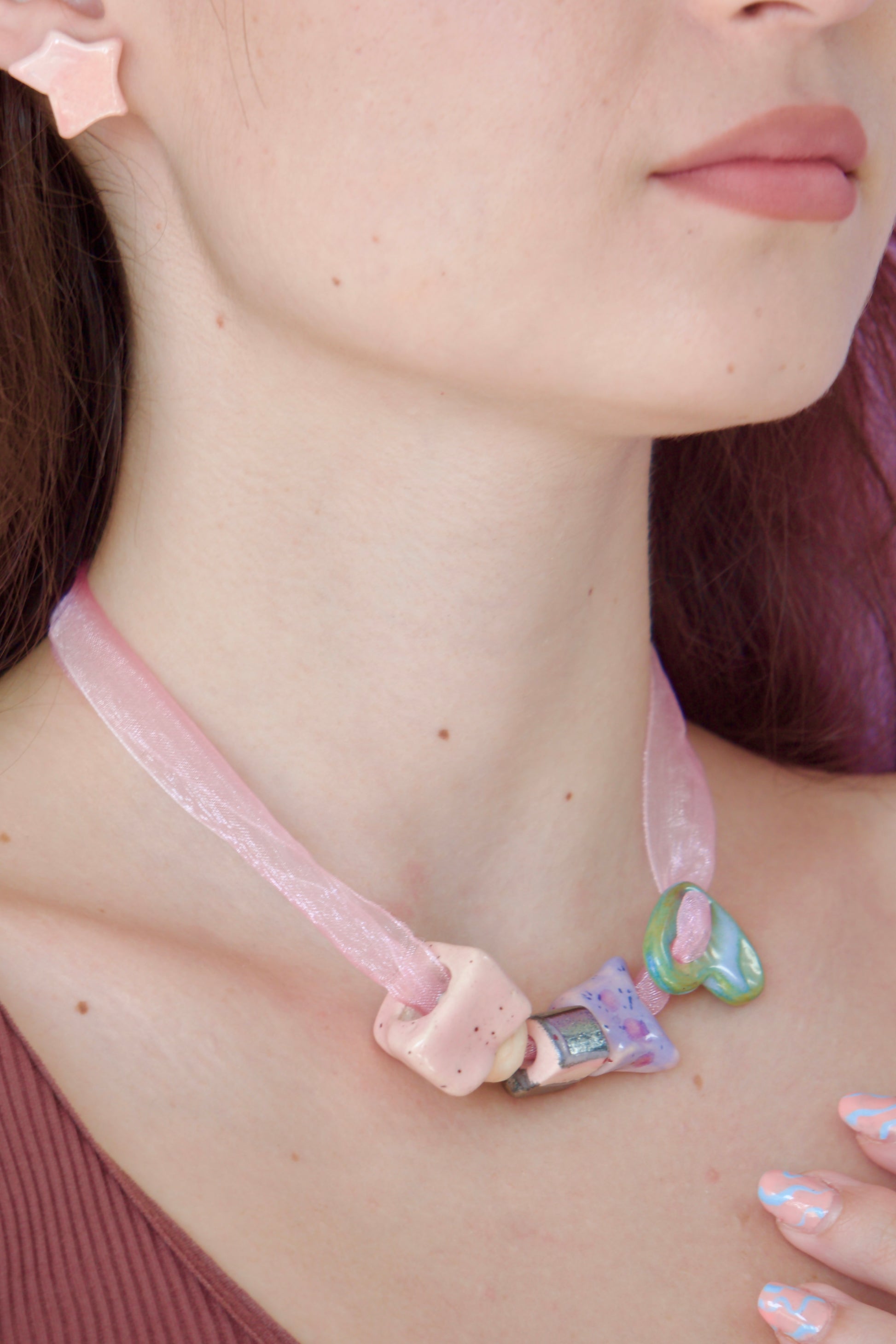 Compoziţie colier: charmuri (mărgele), asamblate pe şnur din organza. Lugimea este ajustabilă.