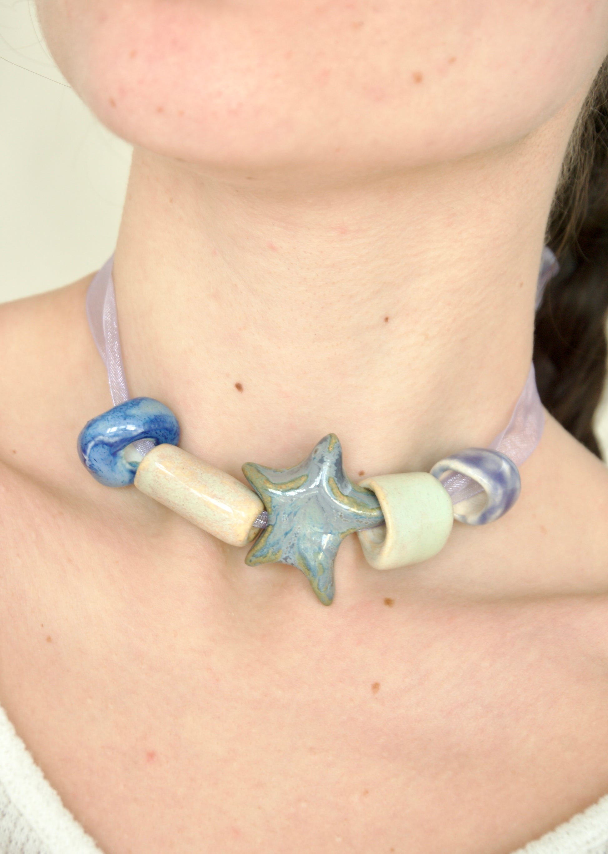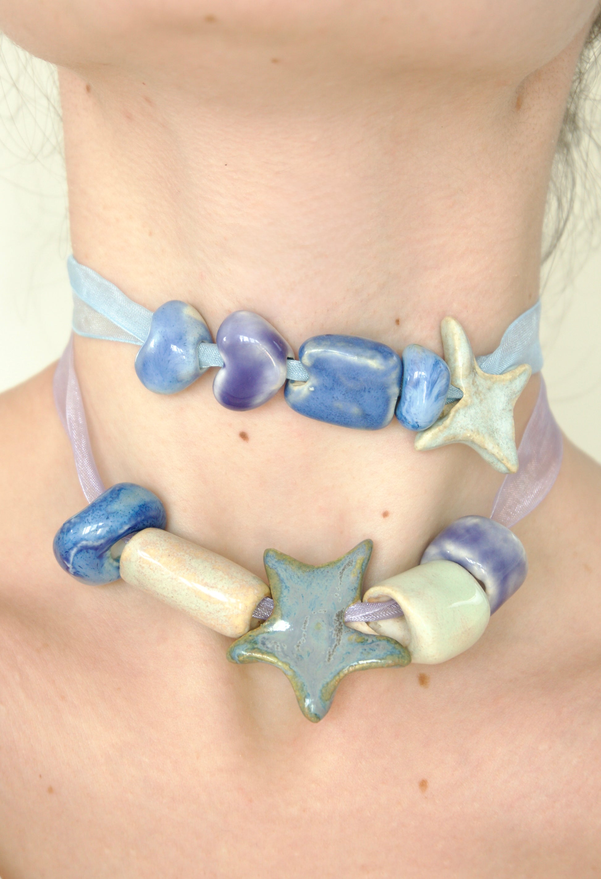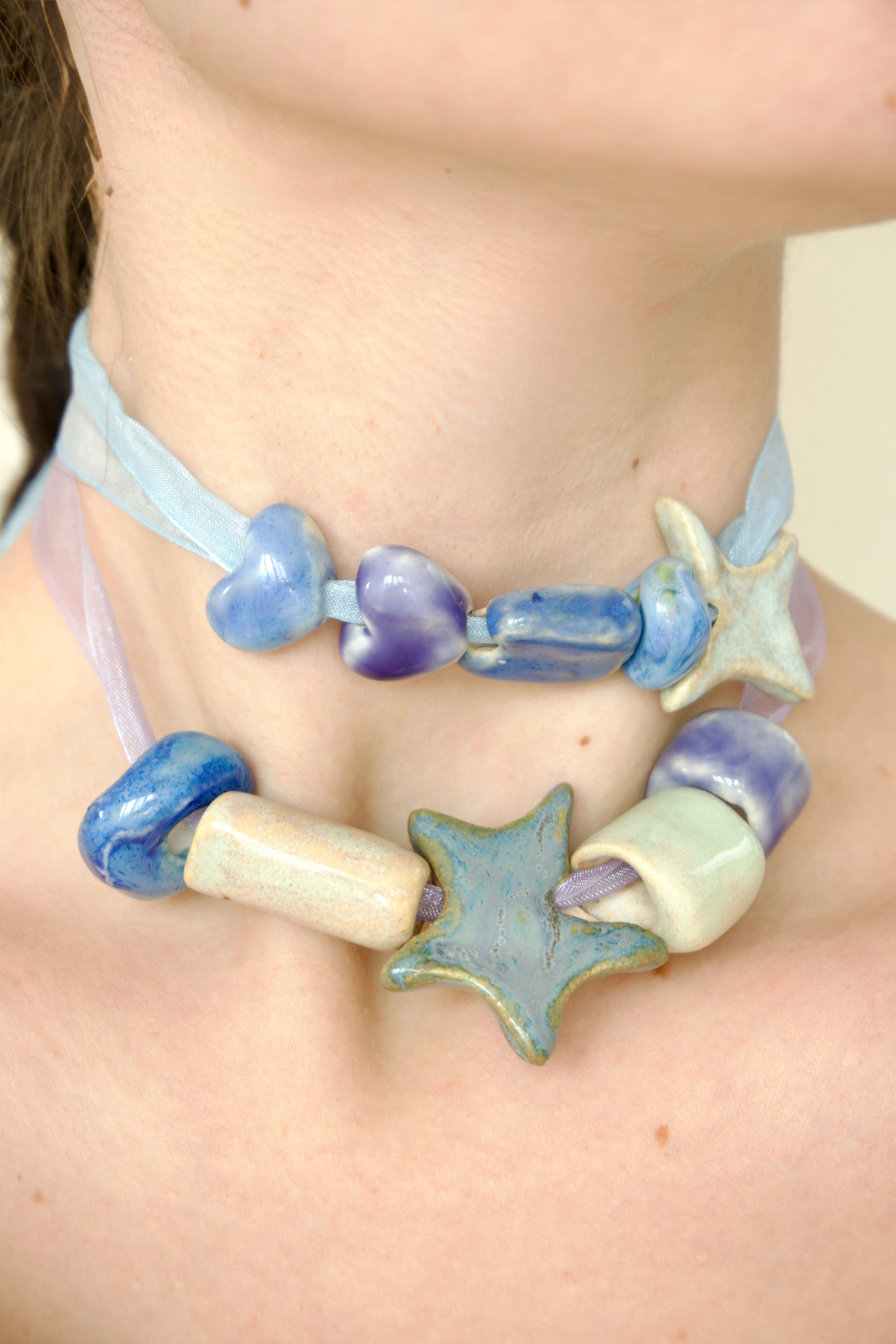 Colier compus din charmuri (mărgele) din ceramică și/sau porțelan, asamblate pe șnur delicat din organza, cu lungime ajustabilă.