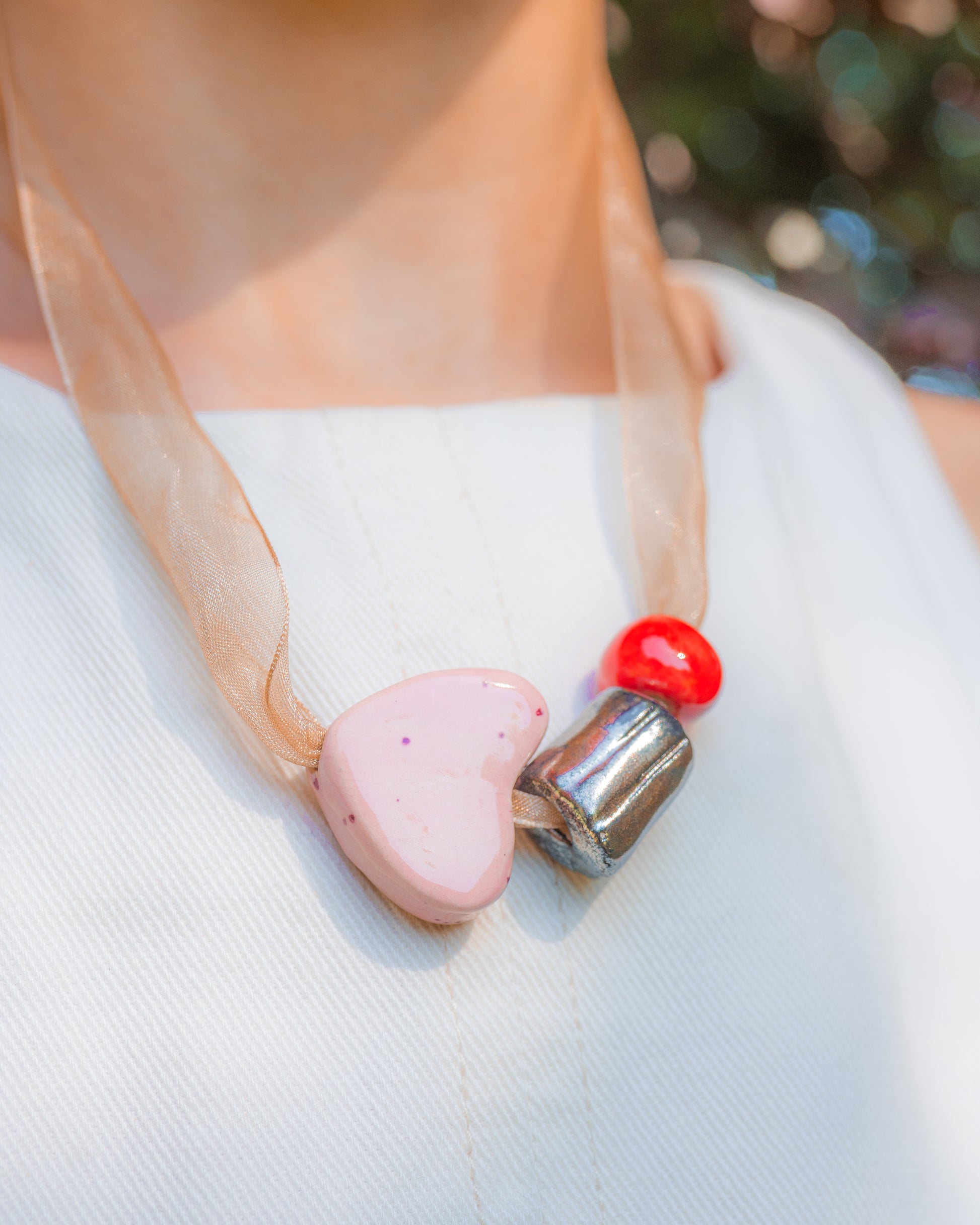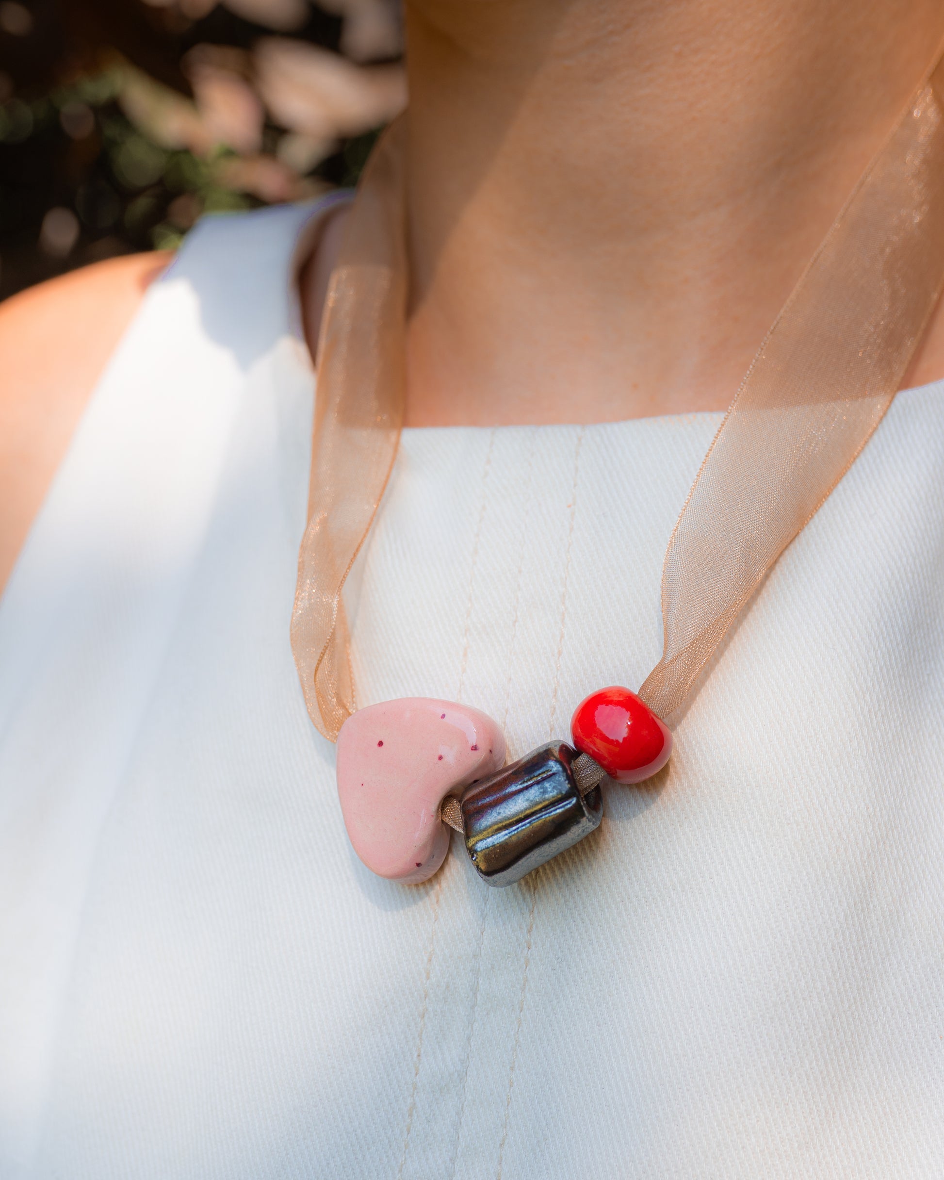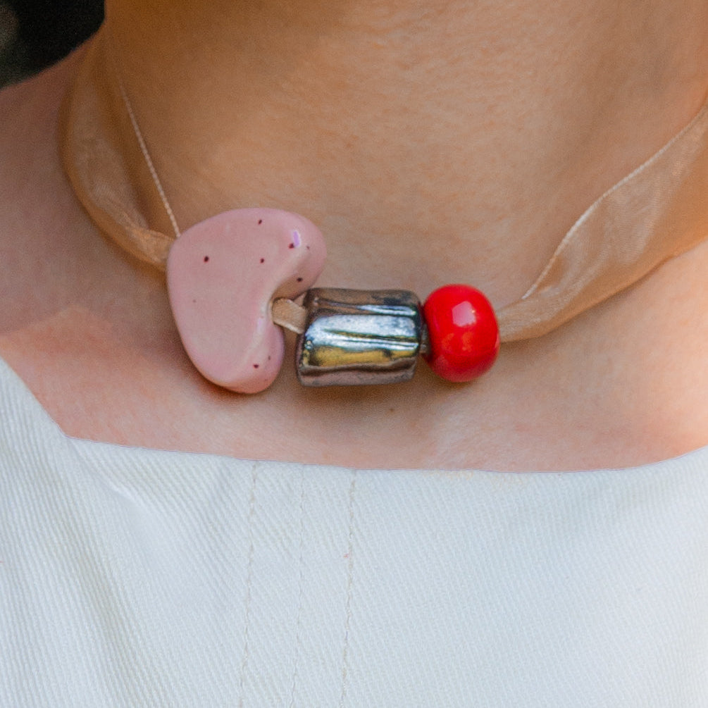 Un colier sculptural, unde delicatețea și contrastul se întâlnesc într-o formă jucăușă. O inimă roz pudrat din mase ceramice, un cilindru cu reflexe metalice și o bilă roșie intens, toate prinse pe un choker din organza bej.