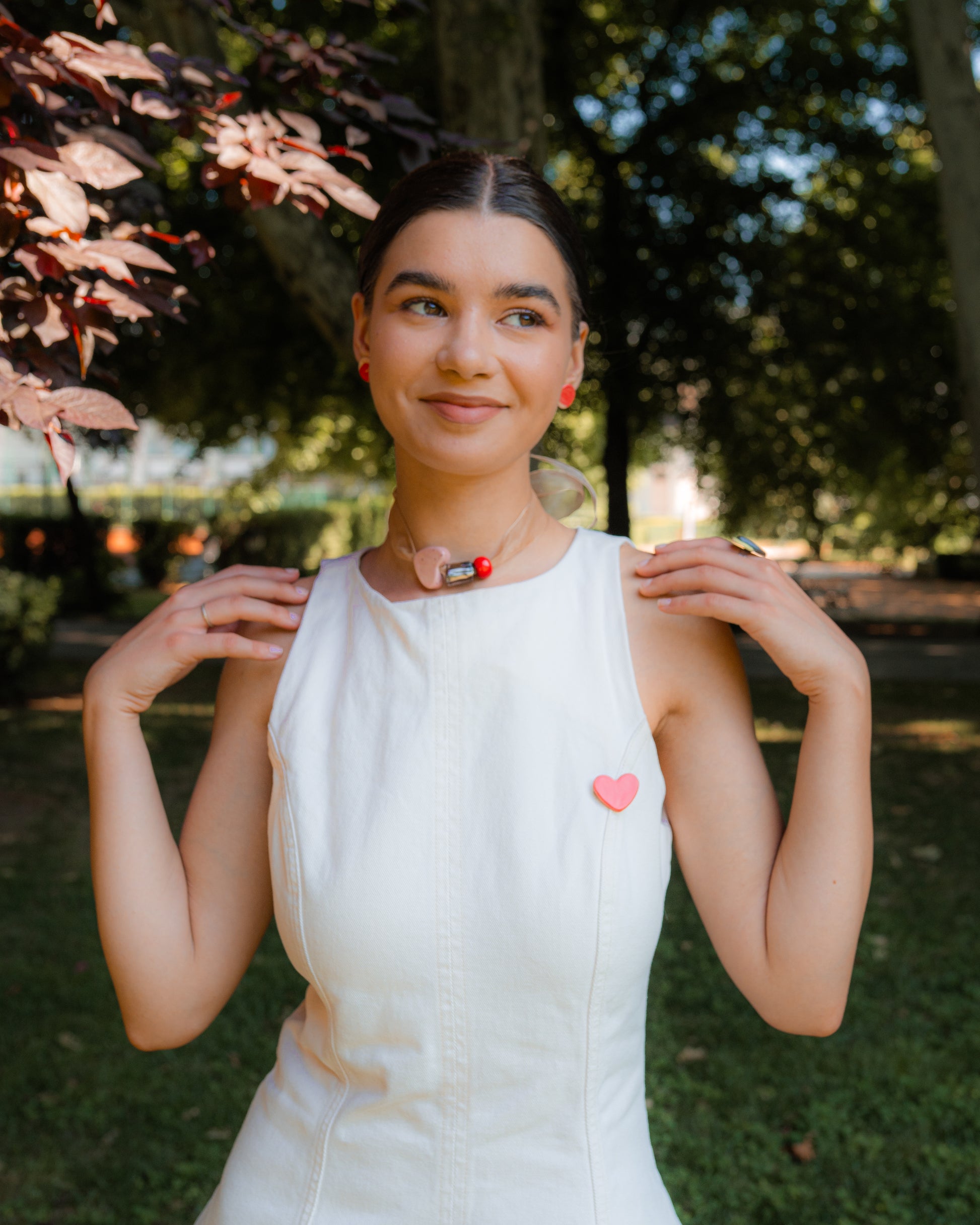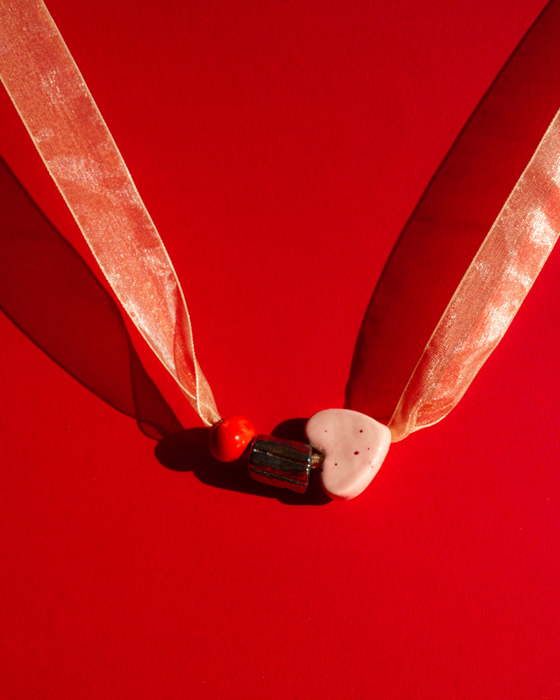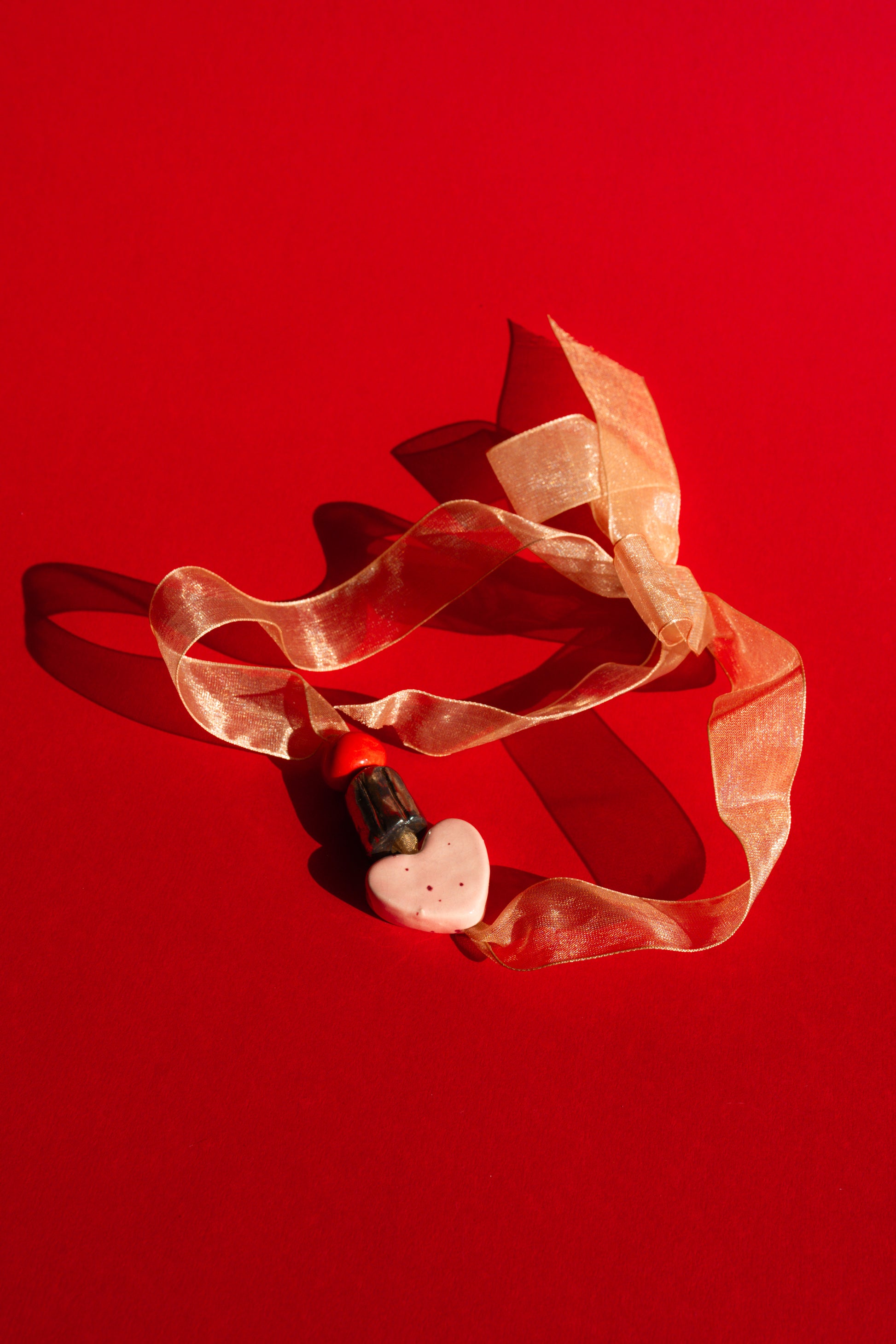 Un colier sculptural, unde delicatețea și contrastul se întâlnesc într-o formă jucăușă. O inimă roz pudrat din mase ceramice, un cilindru cu reflexe metalice și o bilă roșie intens, toate prinse pe un choker din organza bej.