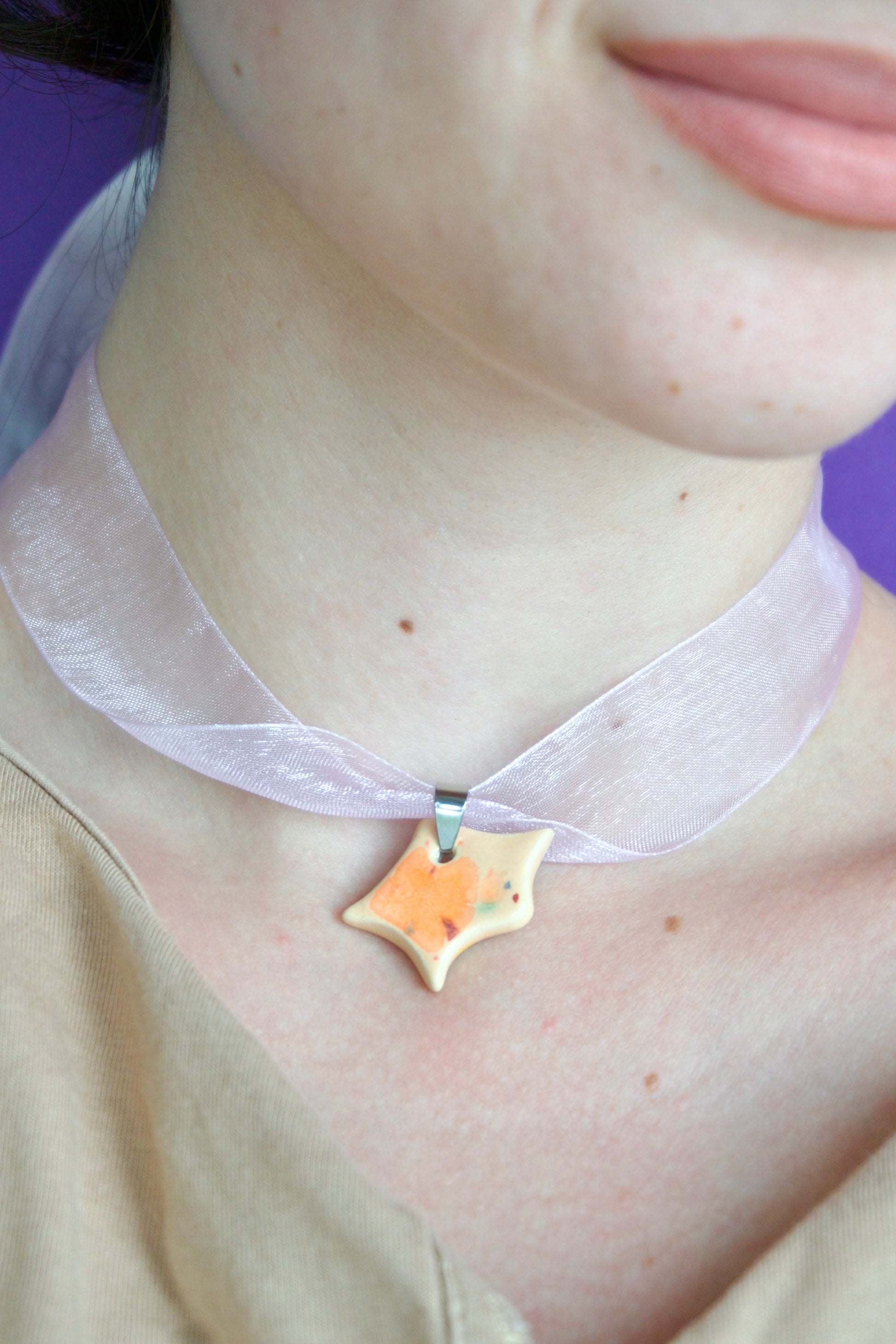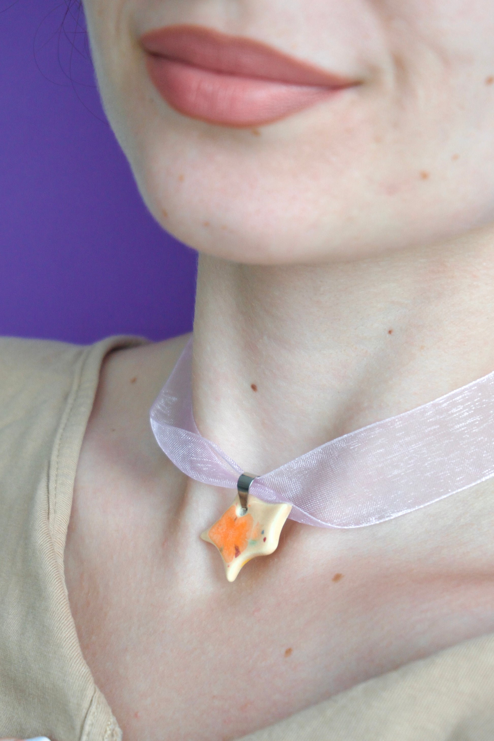 Compoziţie pandantiv: mase ceramice, glazuri arse în cuptor la peste 1000°C. Choker din organza, anou din oțel inoxidabil hipoalergenic.