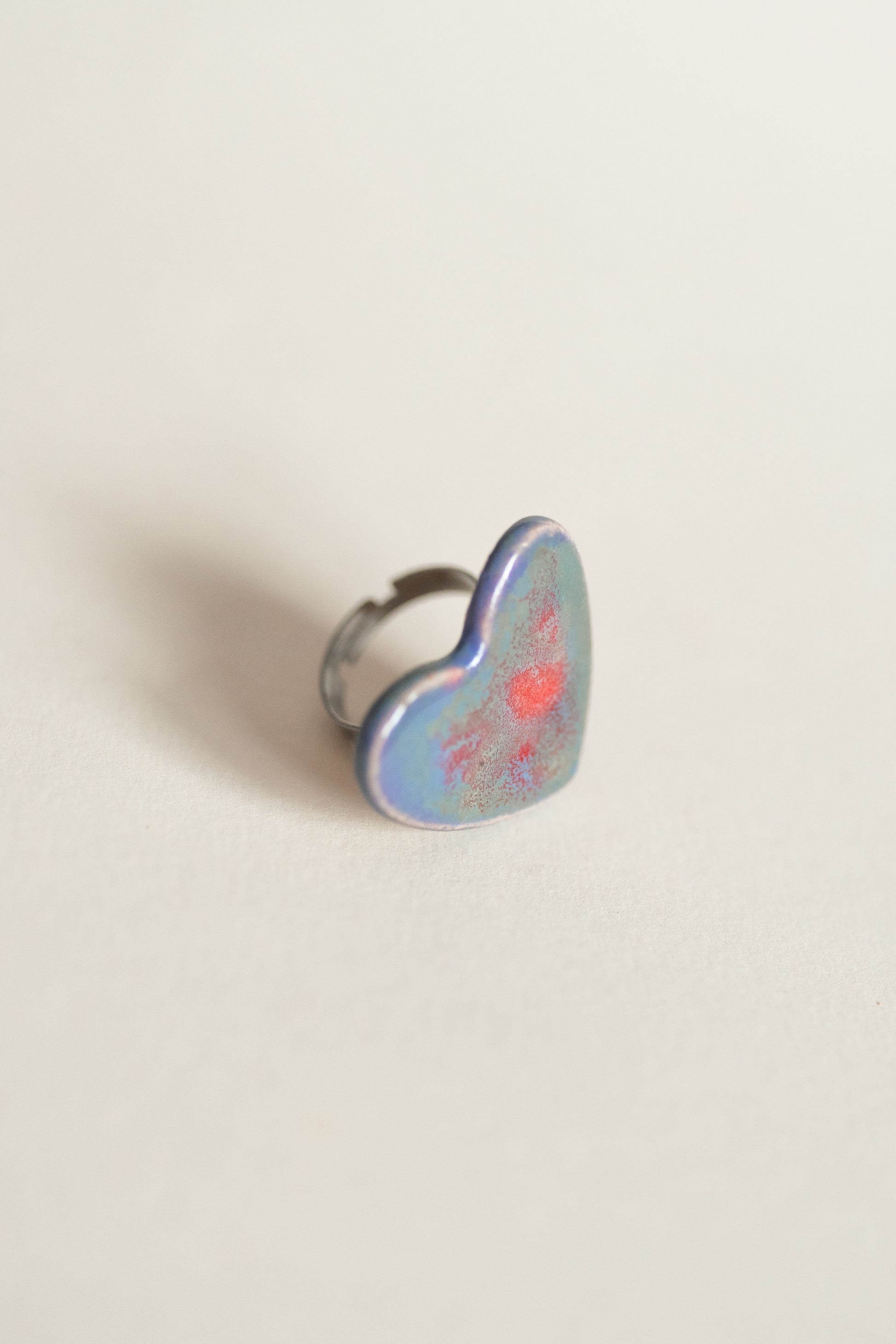 Inel reglabil cu element ceramic în formă de inimă, decorat cu o glazură multistrat iridescentă în tonuri de mov pastel, albastru și roșu difuz. Suprafața este ușor sidefie, cu o textură vizuală ce amintește de un pastel pe hârtie abrazivă.