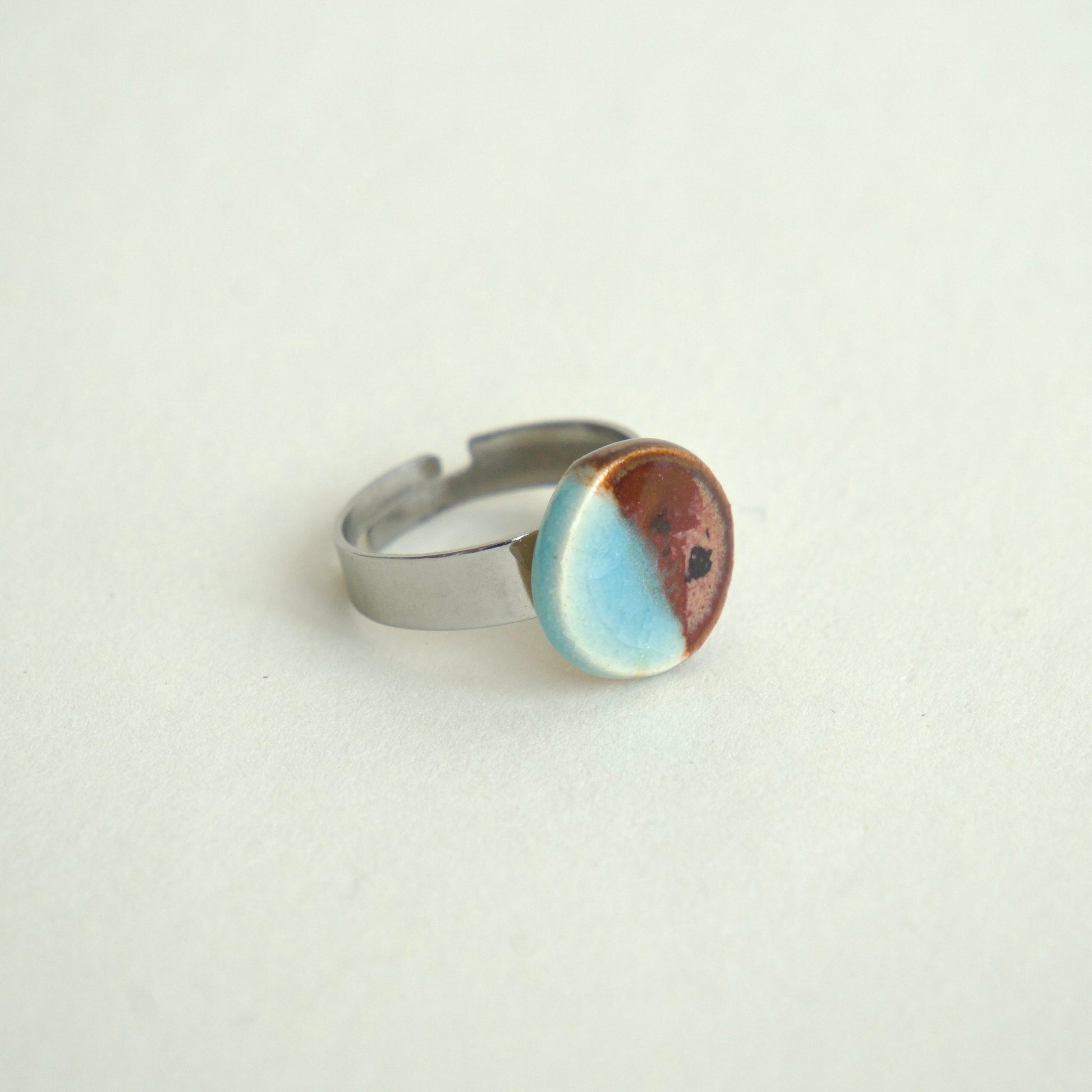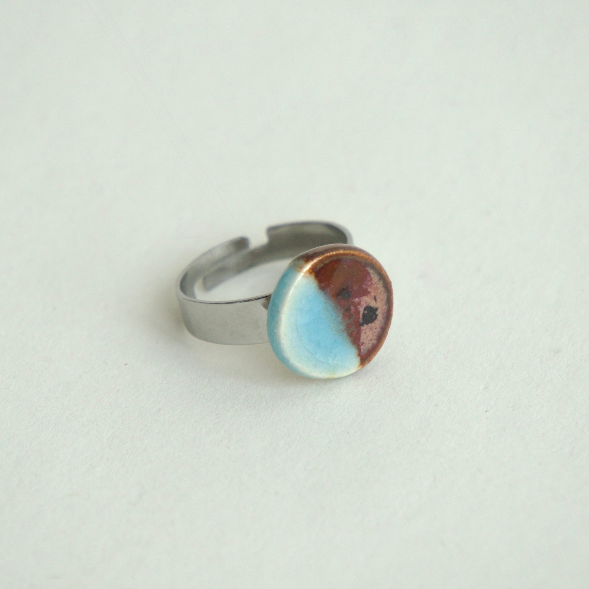 Inel handmade din ceramică, formă rotundă în culori degrade de brun și bleu ciel. Bijuterie minimalistă, perfectă pentru un look original și modern.