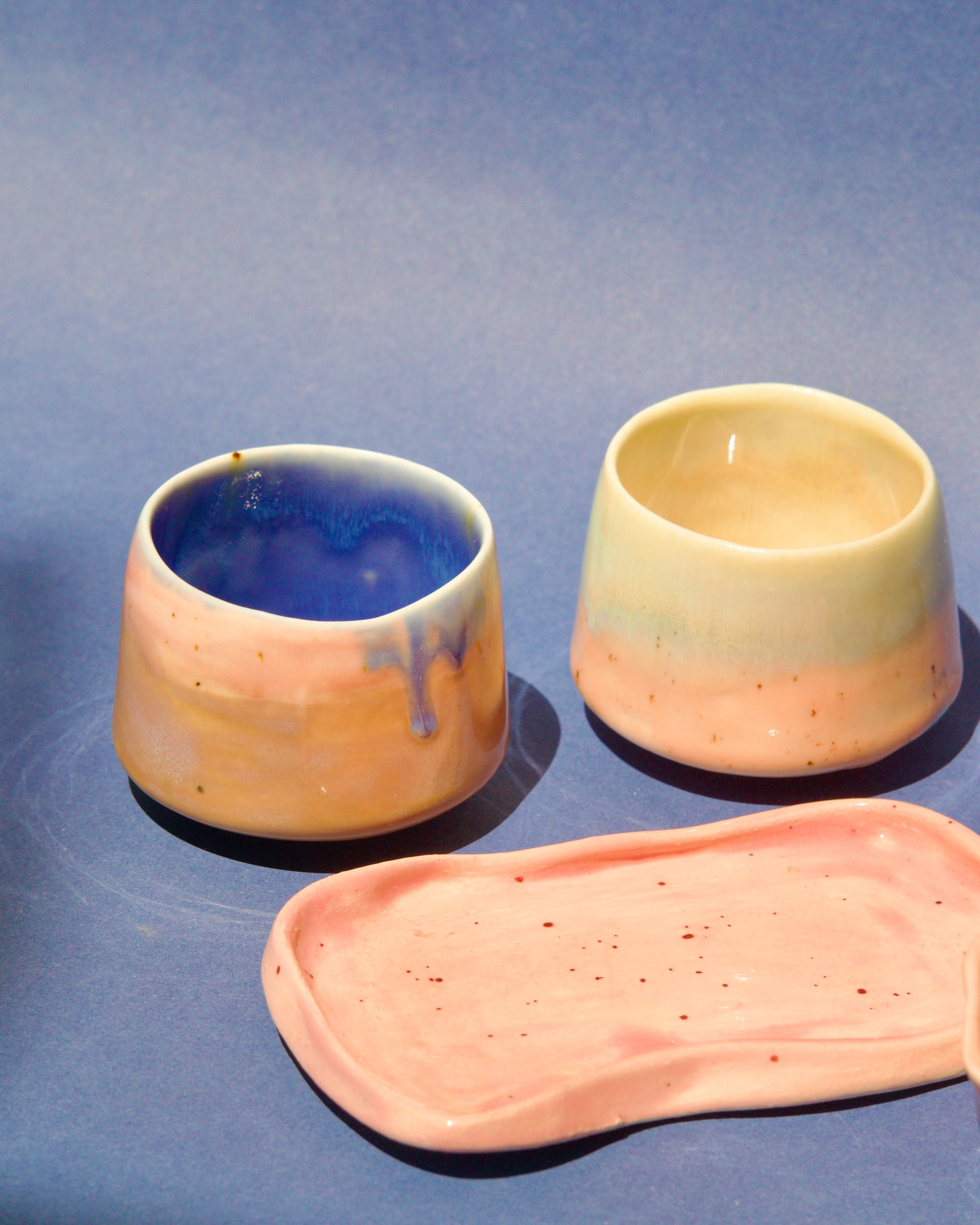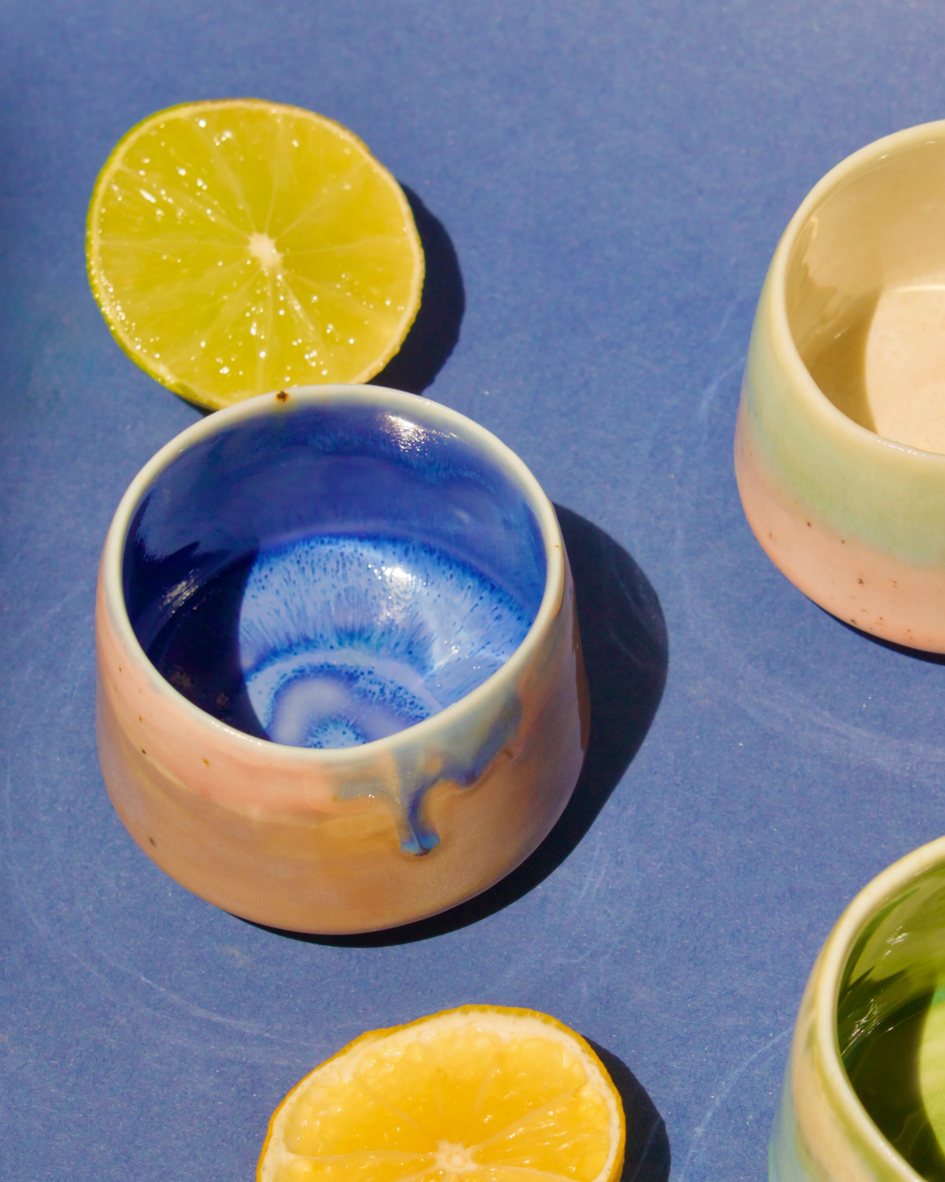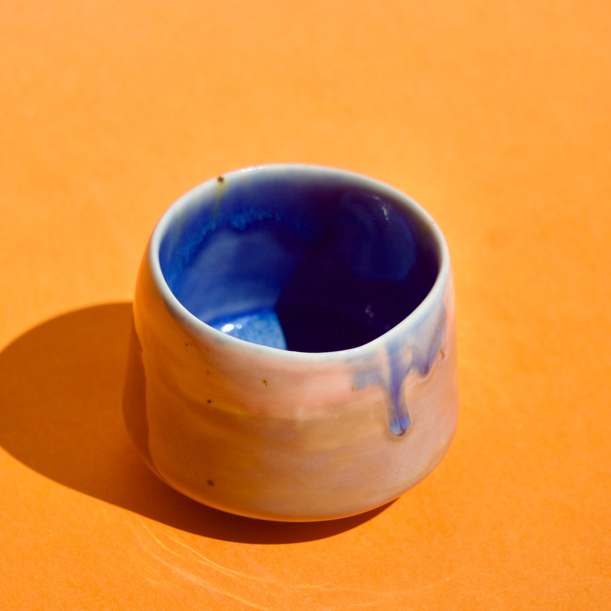 Cană espresso realizată din semi-porțelan ars la 1200°C. Exteriorul este glazurat în mov pastel, cu accente albastre, iar interiorul complet glazurat în albastru gri creează un contrast cromatic armonios.